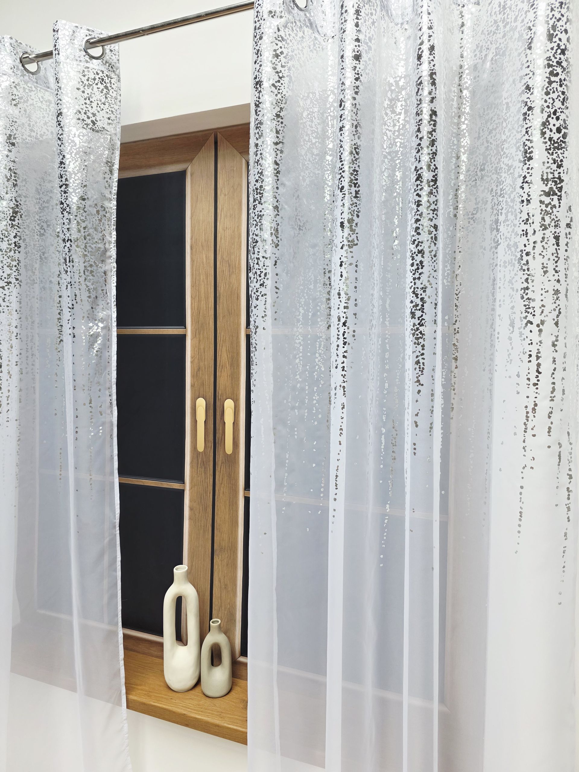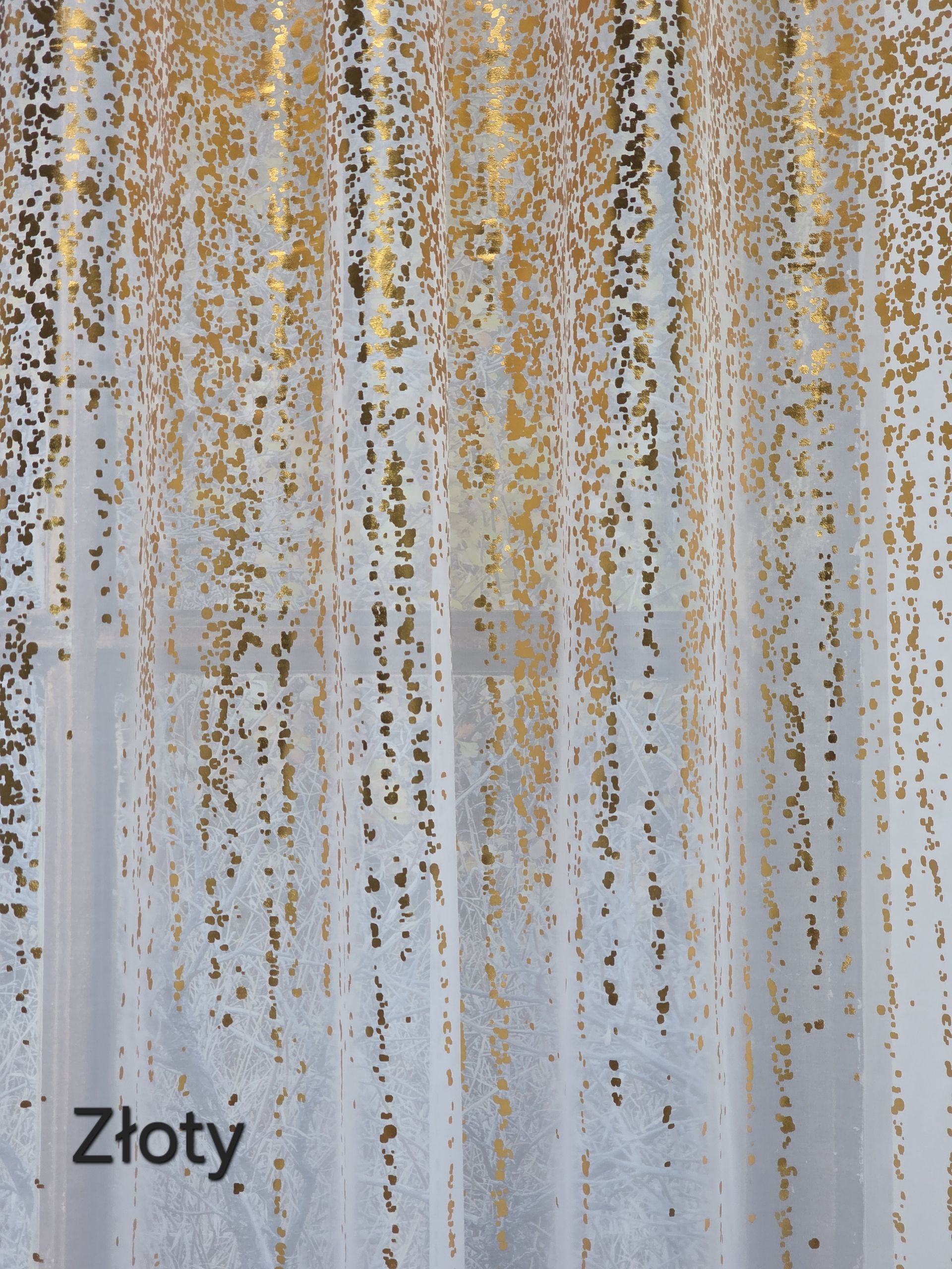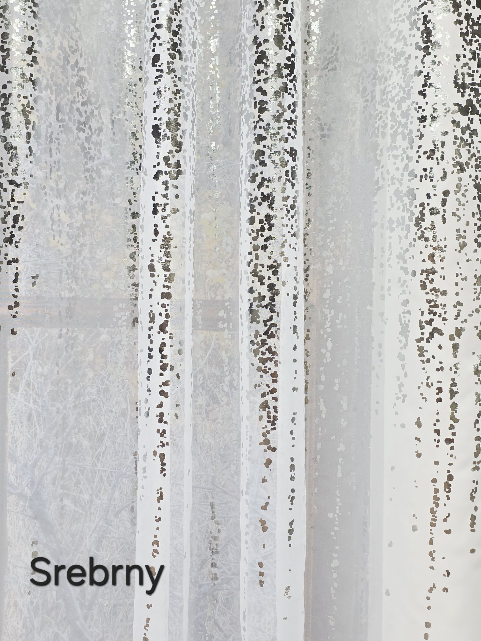 Wyjątkowy wzór nakrapianego złota lub srebra został naniesiony z niezwykłą precyzją, przypominając gwiezdny pył opadający kaskadą z górnej części tkaniny. Dzięki temu produkt nie przytłacza wnętrza, lecz delikatnie rozprasza wpadające światło słoneczne, tworząc w domu kojący, świetlisty spektakl. Materiał jest niezwykle lekki i miękki w dotyku, a jednocześnie charakteryzuje się trwałością, która zadowoli nawet najbardziej wymagających estetów ceniących elegancję.