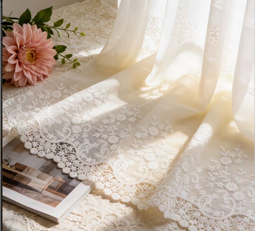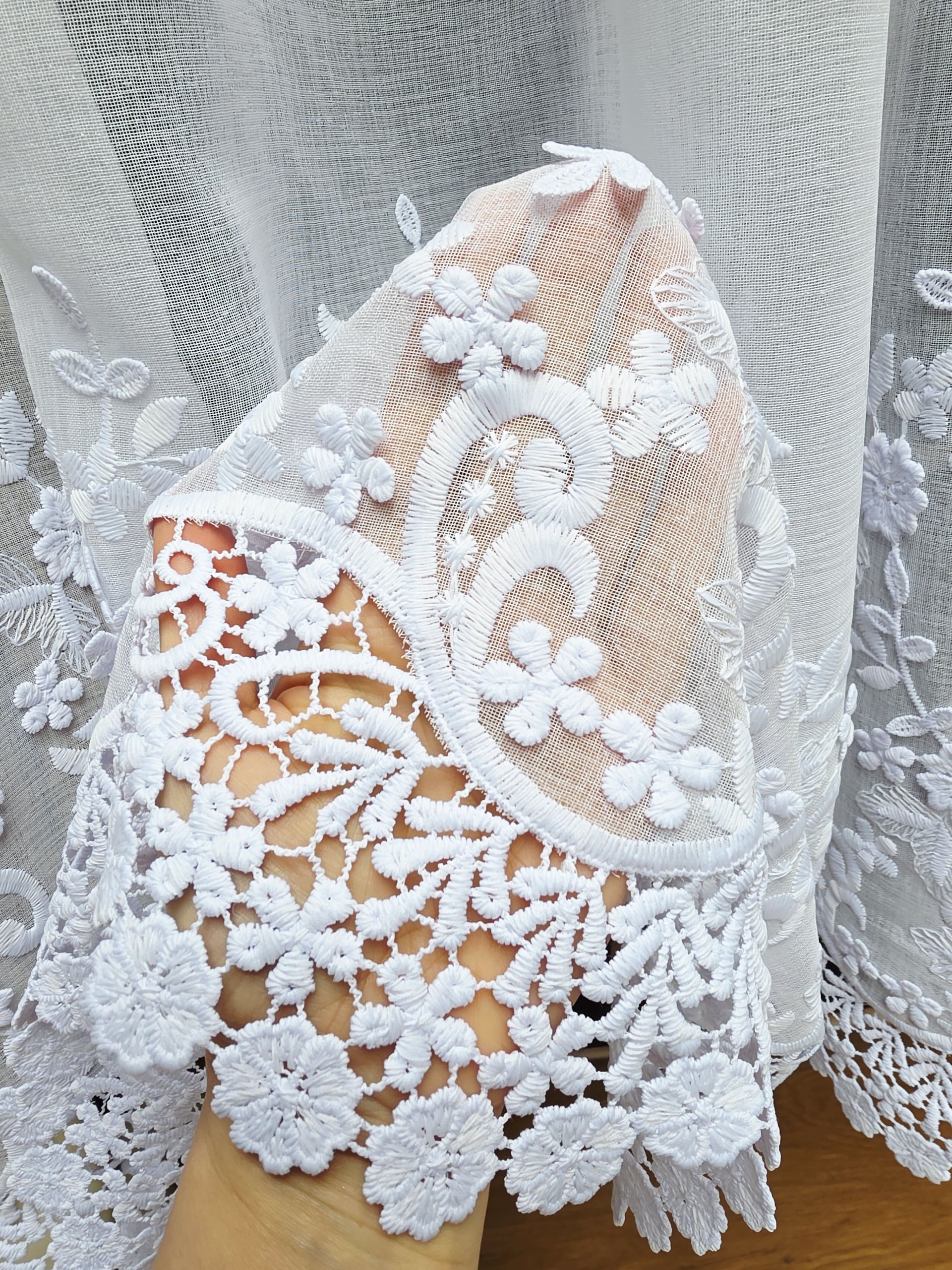 Boki oraz dół firany zdobi szeroki, bogato haftowany pas koronki z motywem florystycznym. Wymiar 130×250 cm sprawia, że firanka sięga do samej podłogi, co optycznie podwyższa pomieszczenie i nadaje mu sznytu.