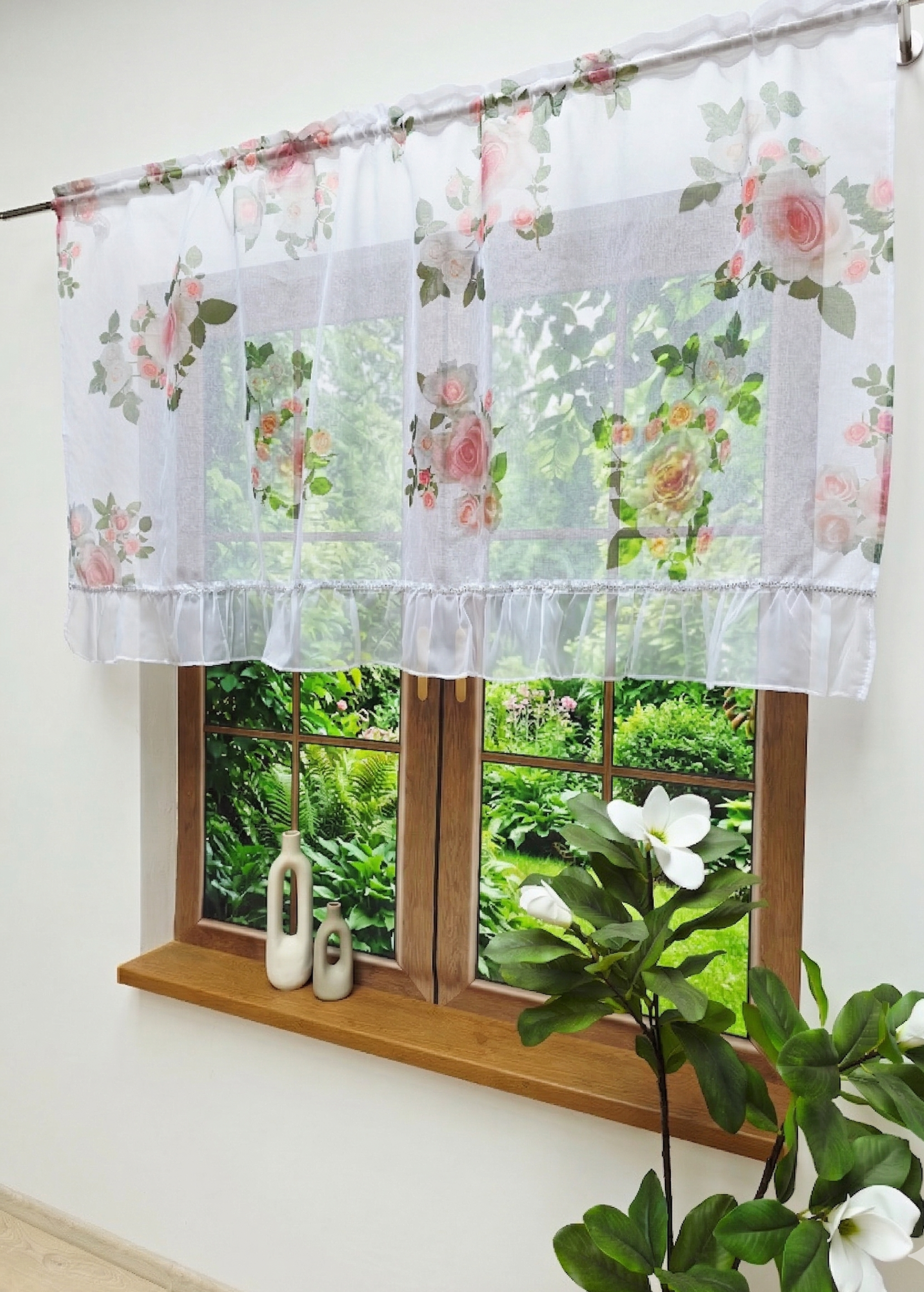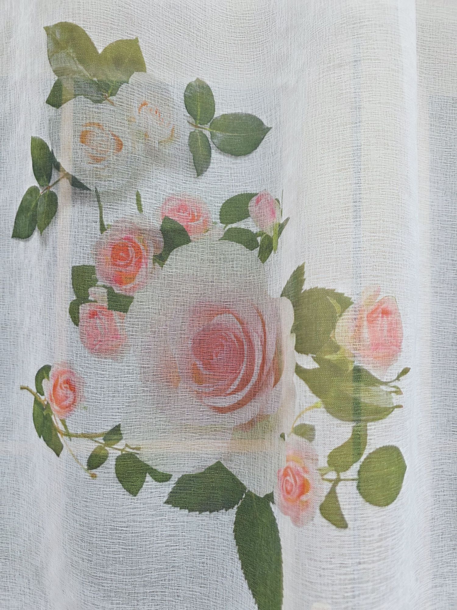 Materiał zdobi subtelny nadruk w różowe kwiaty. Pastelowa kolorystyka i precyzyjne detale sprawiają, że firana wygląda niezwykle lekko i nie przytłacza wnętrza.