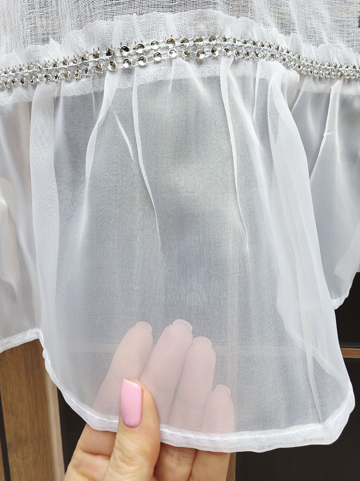 Dolna krawędź firany zakończona jest efektowną falbaną, którą oddziela lśniący, srebrzysty pasek cyrkonii. Ten drobny detal dodaje całości nutkę stylu glamour.