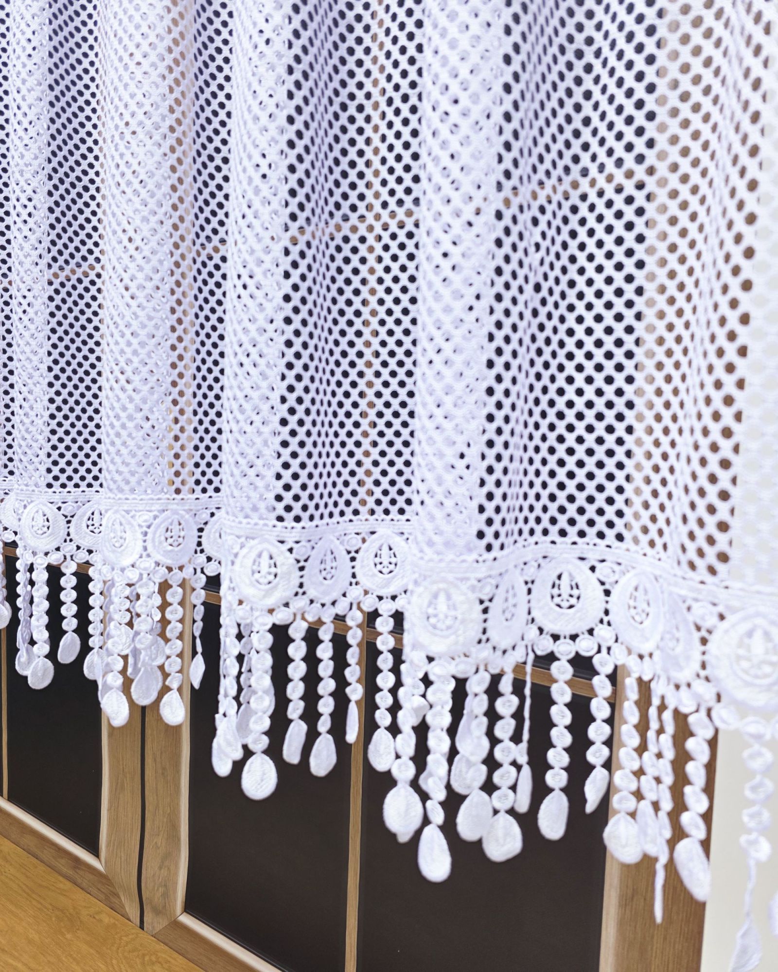 Główna część firany wykonana jest z transparentnej siatki o drobnych oczkach. Taka struktura sprawia, że firana jest niezwykle przewiewna, doskonale przepuszcza naturalne światło i nie zaciemnia pomieszczenia, dbając jednocześnie o prywatność domowników. Dolna krawędź firany została ozdobiona szerokim pasem gipiury.