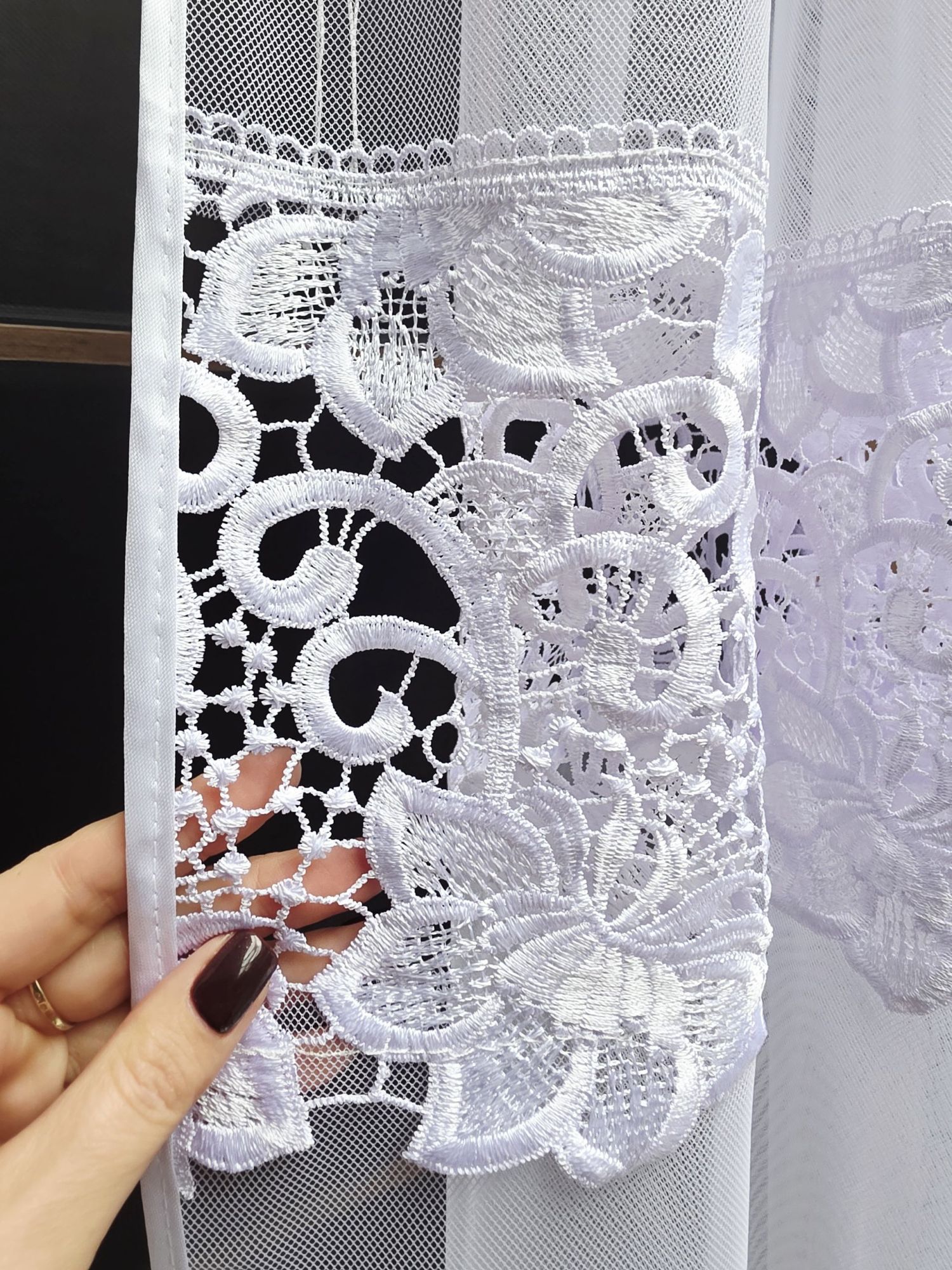 To, co wyróżnia model LUMI, to bogate zdobienie z gipiury. Dwa pasy gipiury – jeden umieszczony w dolnej części, a drugi w połowie wysokości firany – nadają jej wyjątkowego charakteru i sprawiają, że pięknie układa się na oknie. Zalety, wysokogatunkowa, drobna siateczka o delikatnym splocie. Dwa rzędy efektownej gipiury o kwiatowym motywie.