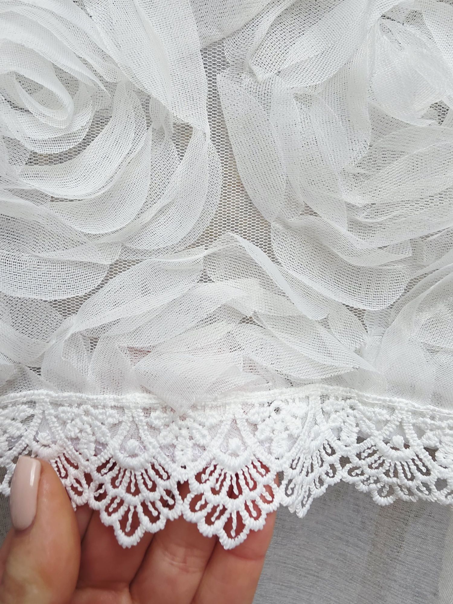 Firana Cosi to nie tylko dekoracja okienna, ale prawdziwe dzieło sztuki, które nada Twojemu domowi niepowtarzalnego charakteru. Górna część zdobiona efektownymi, trójwymiarowymi różami oraz delikatną koronką przyciąga wzrok, tworząc luksusowy akcent, który natychmiast odmienia estetykę salonu czy sypialni.