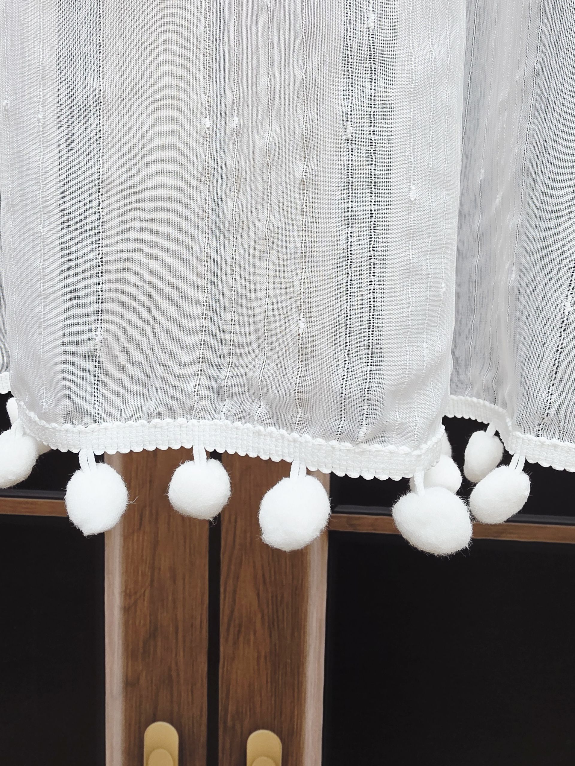 Dół firanki zdobi rząd miękkich, białych pomponików, które nadają całości lekkości i słodkiego uroku.