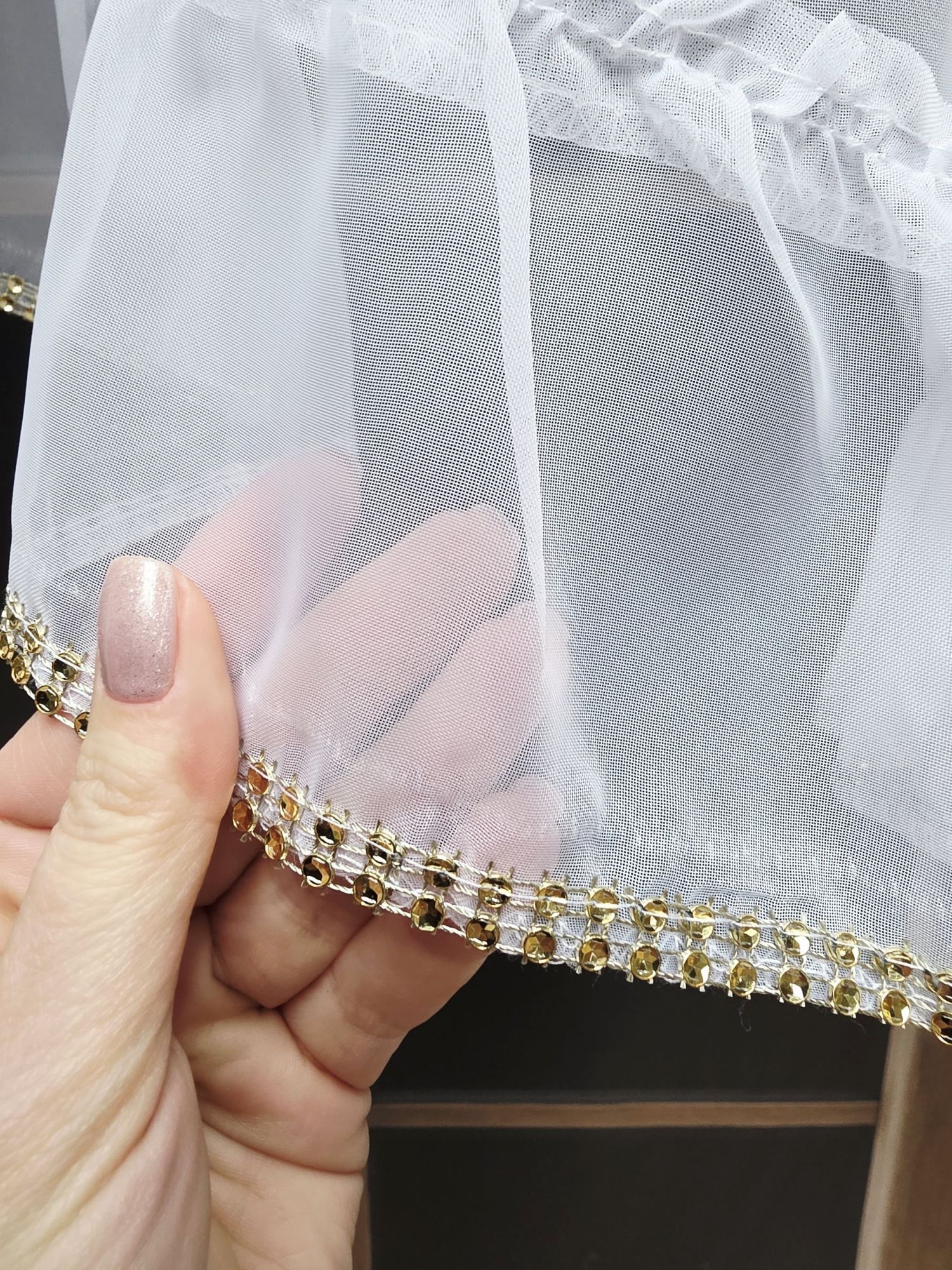Firana składa się z efektownych kaskad (falban), które są obszyte złotą taśmą z cyrkoniami. Dzięki temu pięknie mieni się w promieniach słońca oraz przy wieczornym oświetleniu.