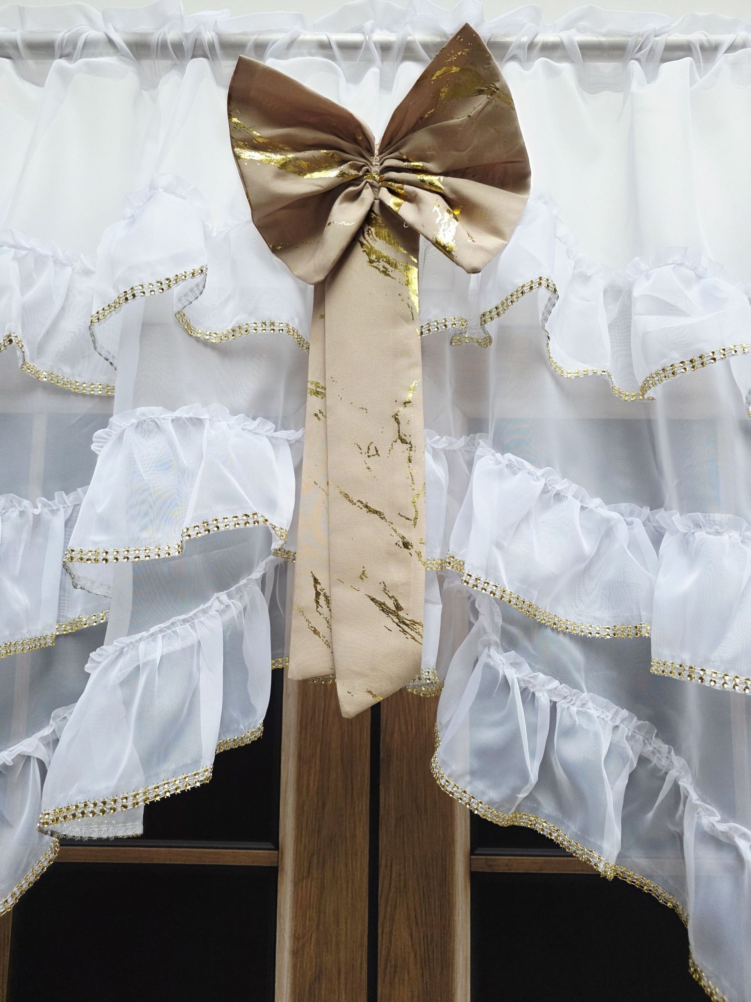 Centralnym punktem dekoracji jest kokarda w kolorze beżowo-złotym, która pięknie wygląda na firance.