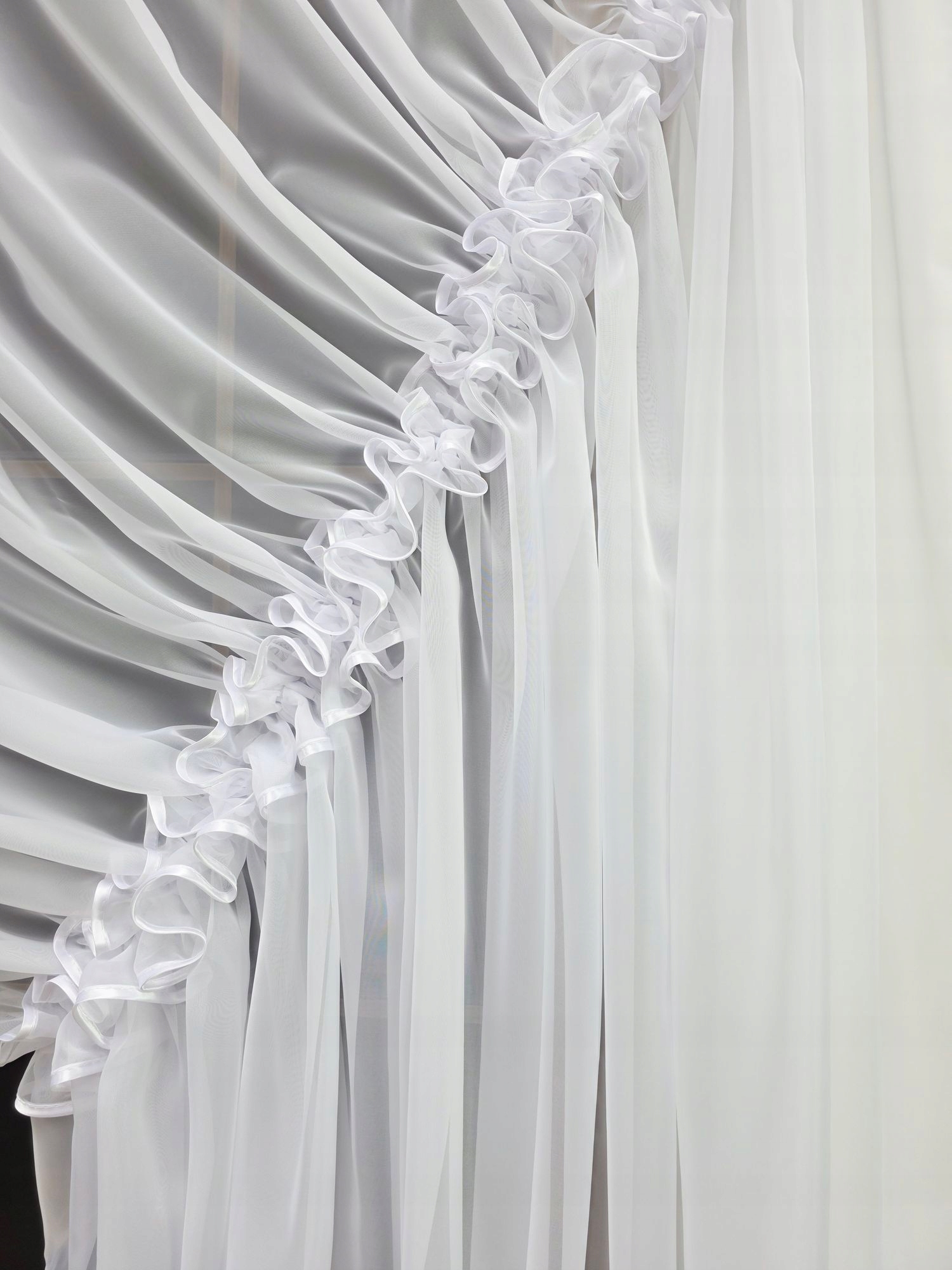 Woal doskonale przepuszcza naturalne światło, jednocześnie zapewniając prywatność domownikom. Unikalne upięcie tworzy dynamiczną i nowoczesną dekorację okna, która nie przytłacza wnętrza, a jednocześnie zapewnia prywatność.
