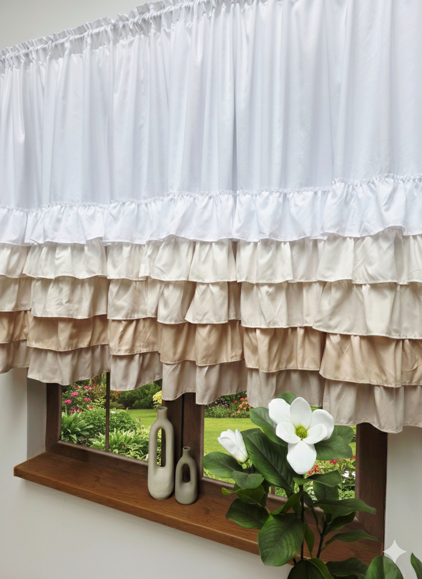 Kluczem do jej magnetyzmu jest unikalne zestawienie kolorystyczne typu ombre, przechodzące od nieskazitelnej bieli u góry, aż po ciepłe kolory u dołu. Wielowarstwowe falbany wykonane z najwyższej jakości, delikatnej tkaniny poliestrowej pięknie pracują na wietrze, tworząc w Twoim domu atmosferę lekkości i harmonii. Materiał ten jest niezwykle trwały i łatwy w pielęgnacji, co sprawia, że firanka zachowuje swój nienaganny wygląd oraz świeżość przez bardzo długi czas.