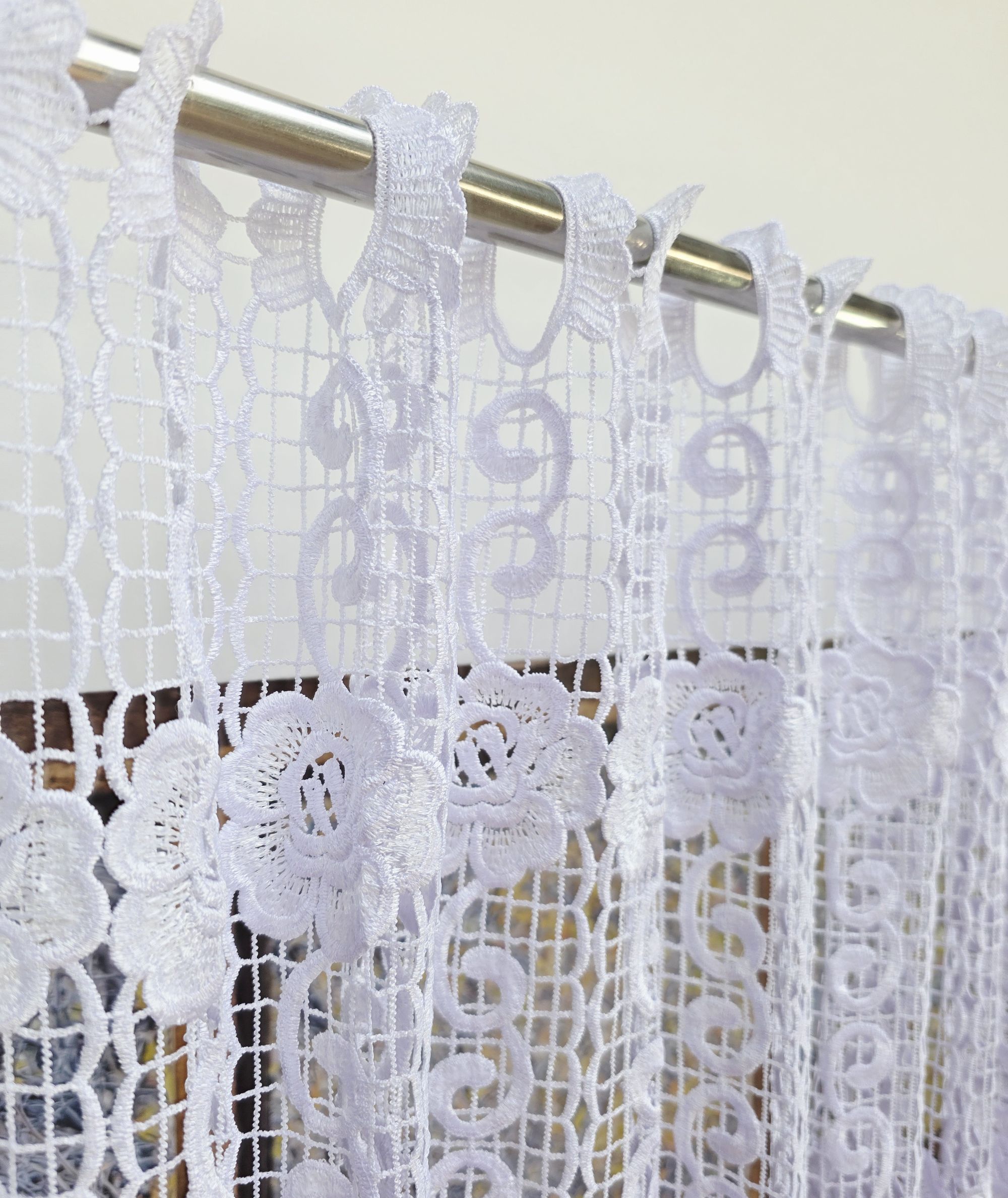 Ekskluzywna gipiura, z której została wykonana firana, zachwyca bogactwem detali i wypukłą strukturą, która jest synonimem luksusu w tradycyjnym wydaniu. Solidny splot materiału gwarantuje, że produkt zachowa swój nienaganny kształt i śnieżnobiałą czystość przez lata, stając się centralnym punktem domowej aranżacji.