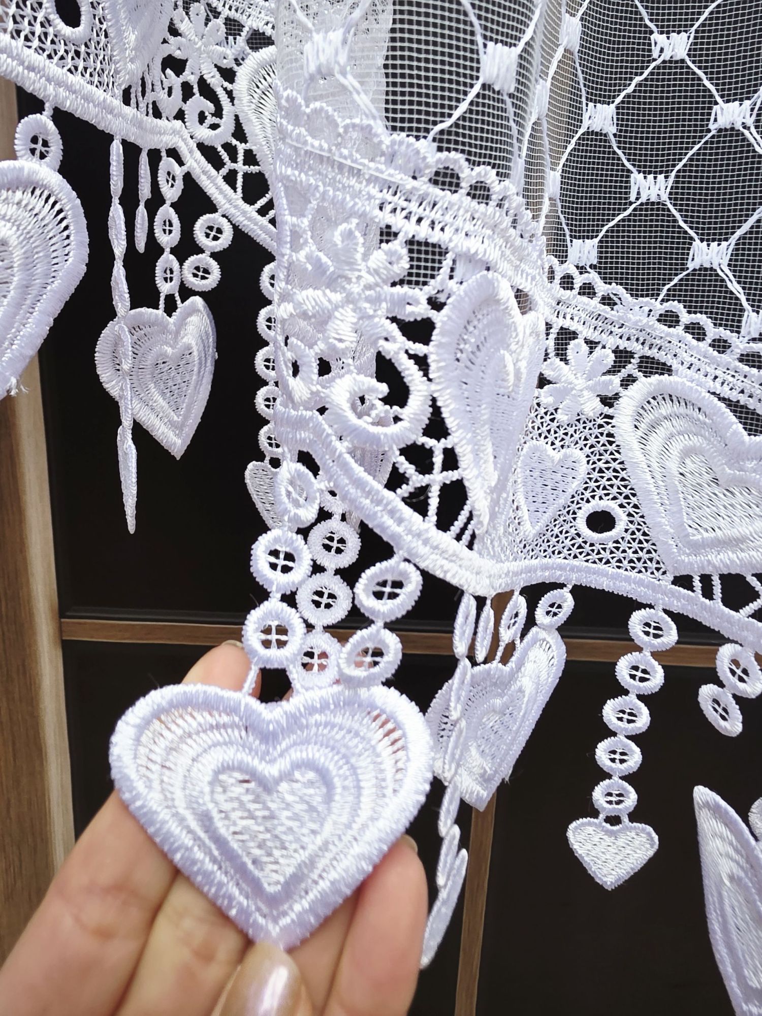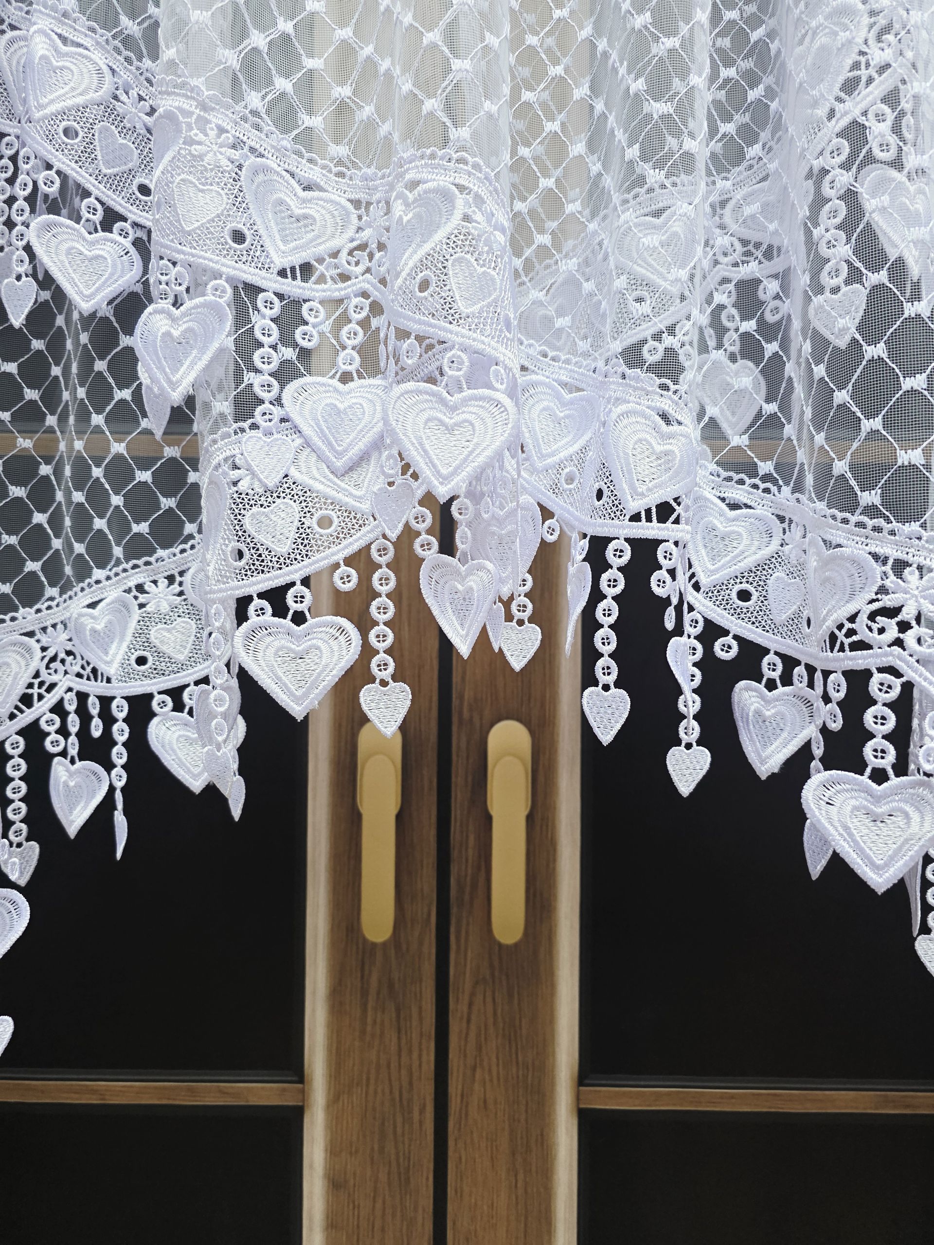 Głównym atutem modelu LOTA jest jej unikalne wykończenie. Dolna krawędź firany została wycięta i ozdobiona gipiurą w kształcie serc. Wiszące detale tworzą formę delikatnych „sopli”, które pięknie pracują przy każdym podmuchu wiatru, nadając wnętrzu przytulności i wyjątkowego charakteru.
