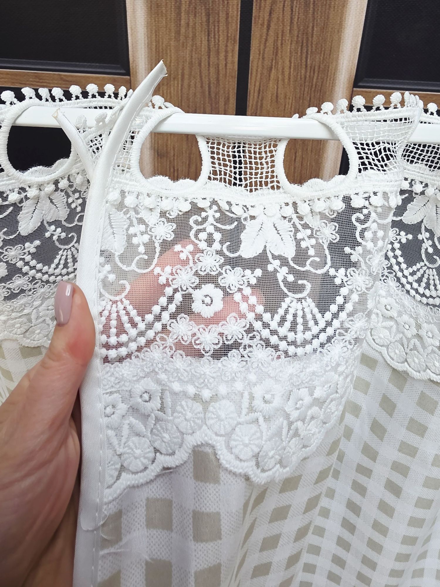 2 Zazdrostki: ( 140 cm szerokość – 50 cm wysokość ) Krótkie firanki montowane bezpośrednio na ramie okna, które zdobi górny pas koronki, nawiązujący do motywu zasłon.
