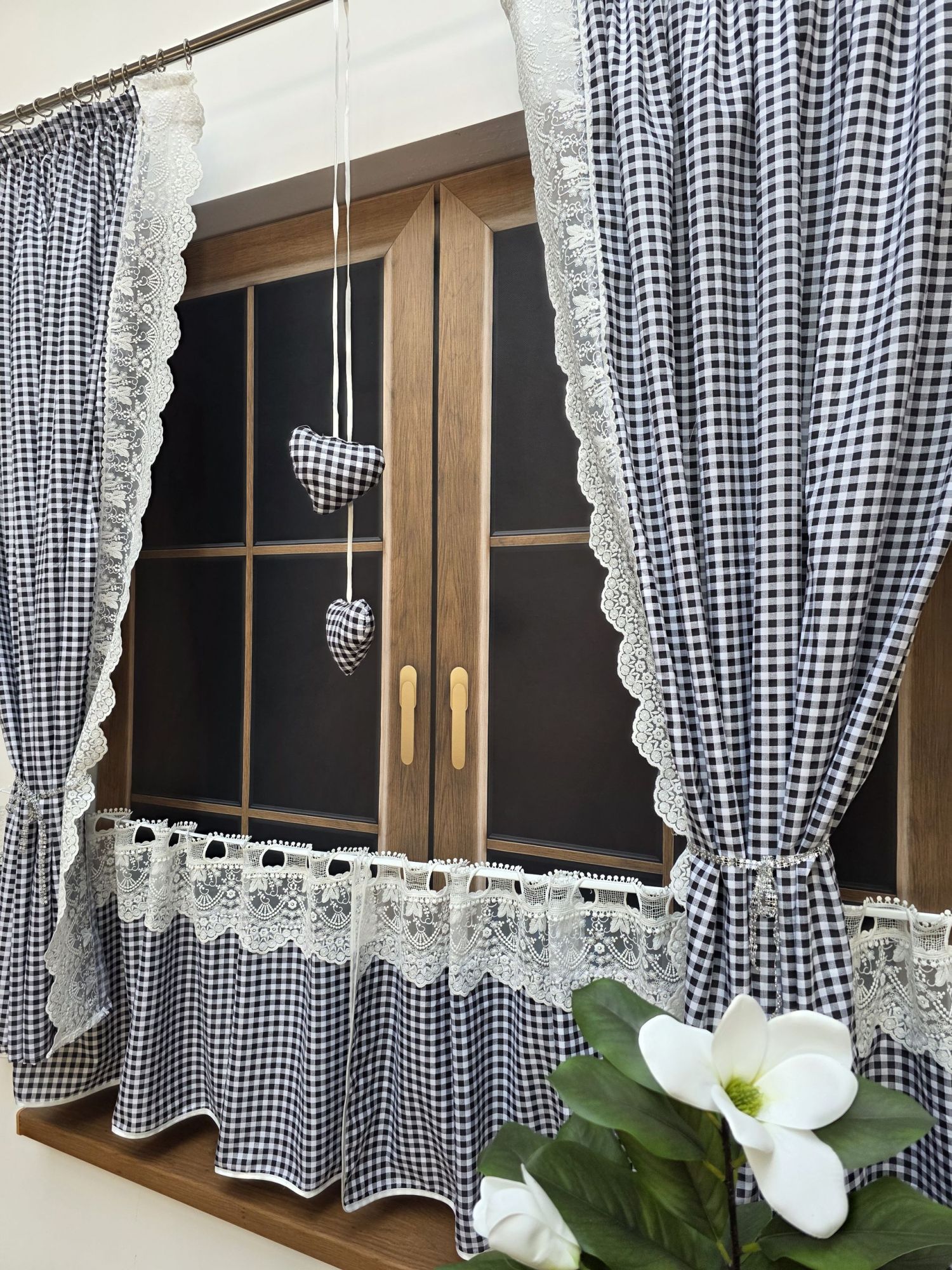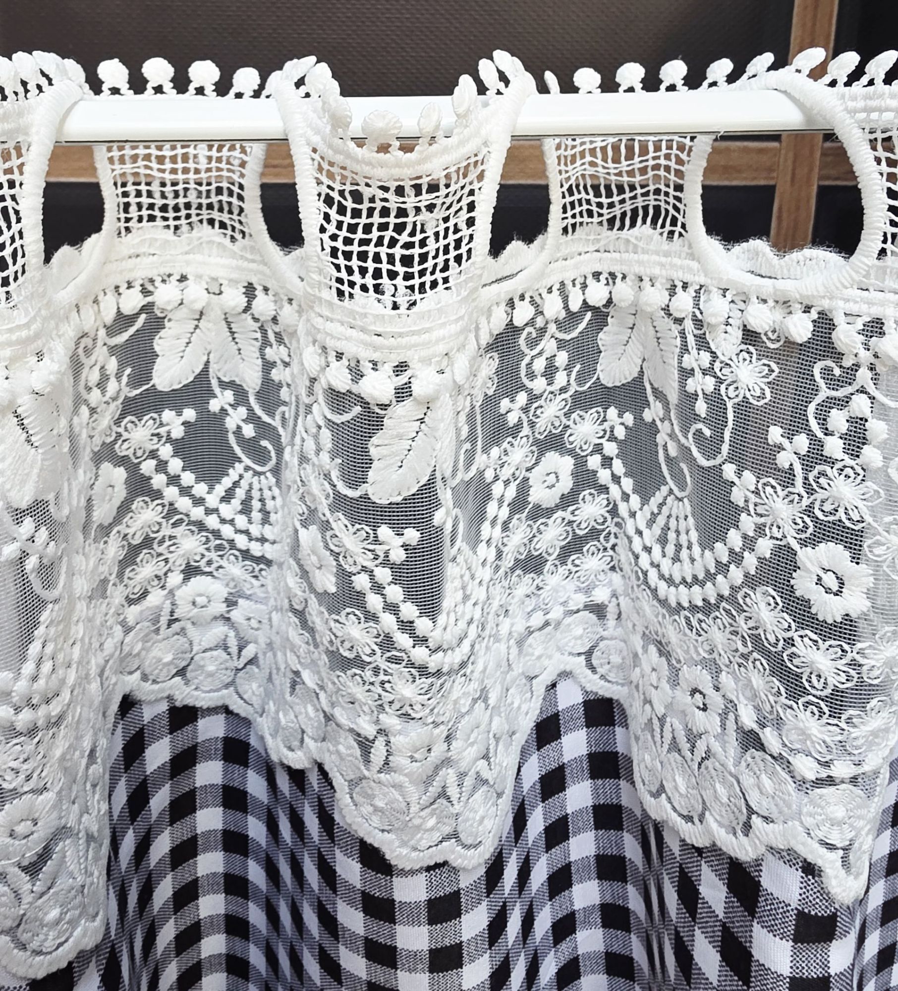 2 Zasłony boczne: ( 120 czm szerokość – 150 cm wysokość ) Wykonane z wysokiej jakości tkaniny w krateczkę, wykończone na wewnętrznych brzegach koronką.
