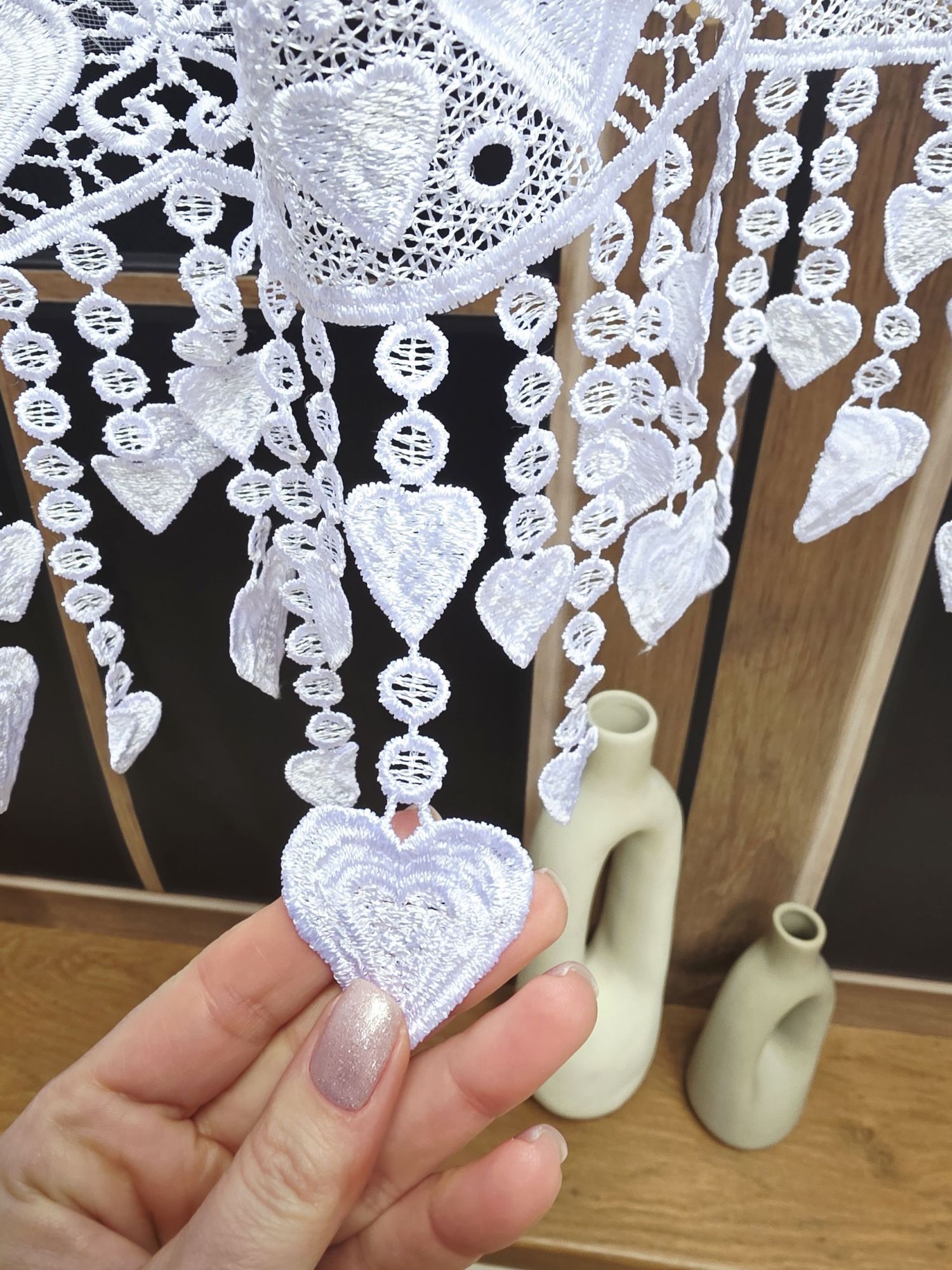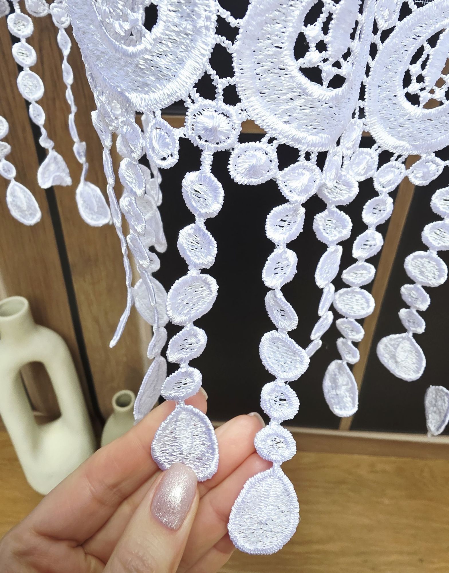 To, co czyni ten model wyjątkowym, to finezyjne wykończenie dolnej krawędzi w kształcie łuku zwieńczone gipiurą. Każdy ruch powietrza sprawia, że zawieszki delikatnie tańczą.