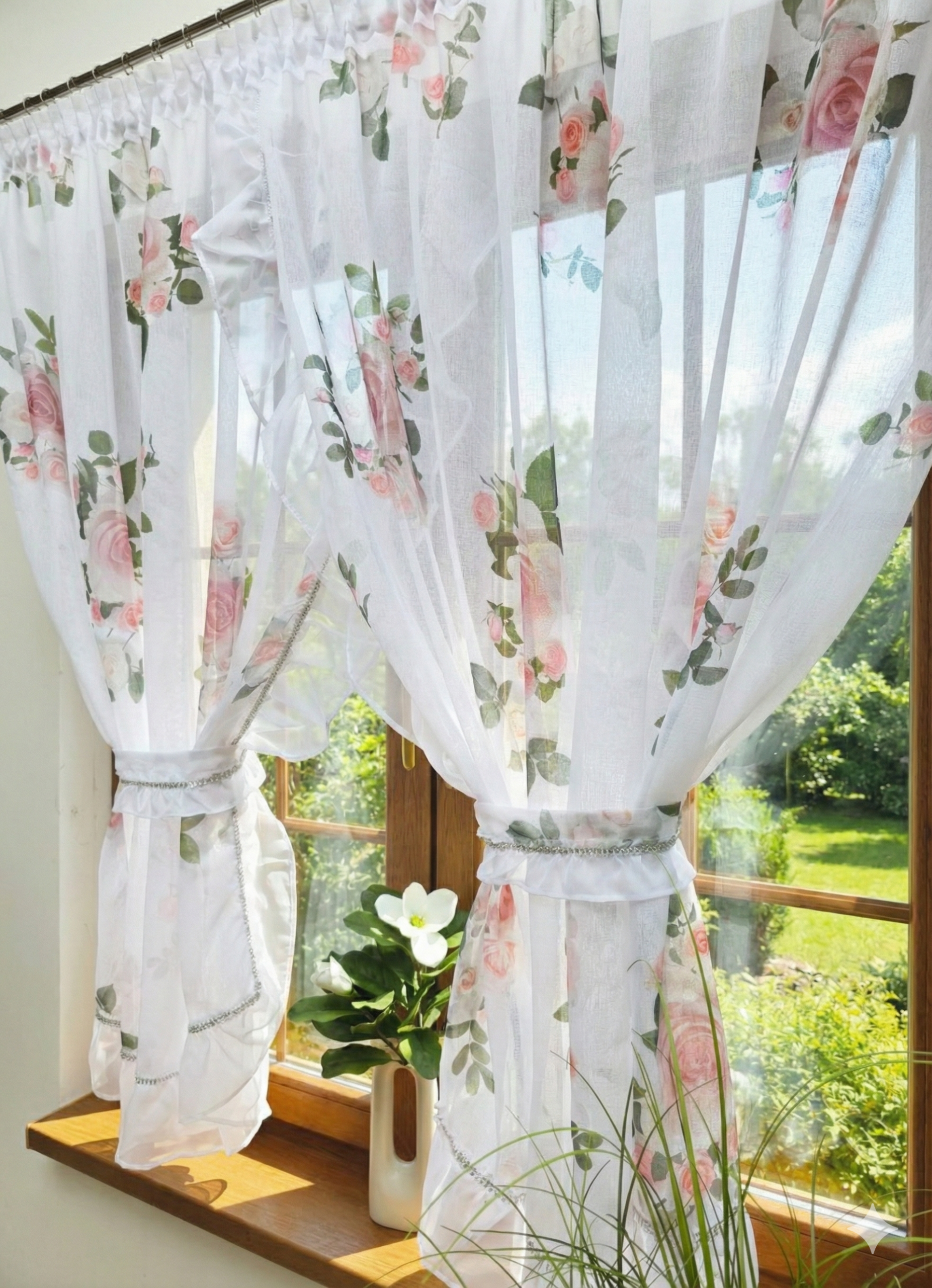 Wykonana z delikatnego półprzezroczystego materiału, który pięknie rozprasza światło, jednocześnie chroniąc prywatność. Połączenie przejrzystej bieli z subtelnym, kwiatowym wzorem sprawia, że pasuje zarówno do mebli w stylu klasycznym, jak i do jasnych, skandynawskich aranżacji.  Krawędzie przy podwiązaniu zostały ozdobione delikatną falbanką, co dodaje jej jeszcze więcej wdzięku i klasycznego uroku.