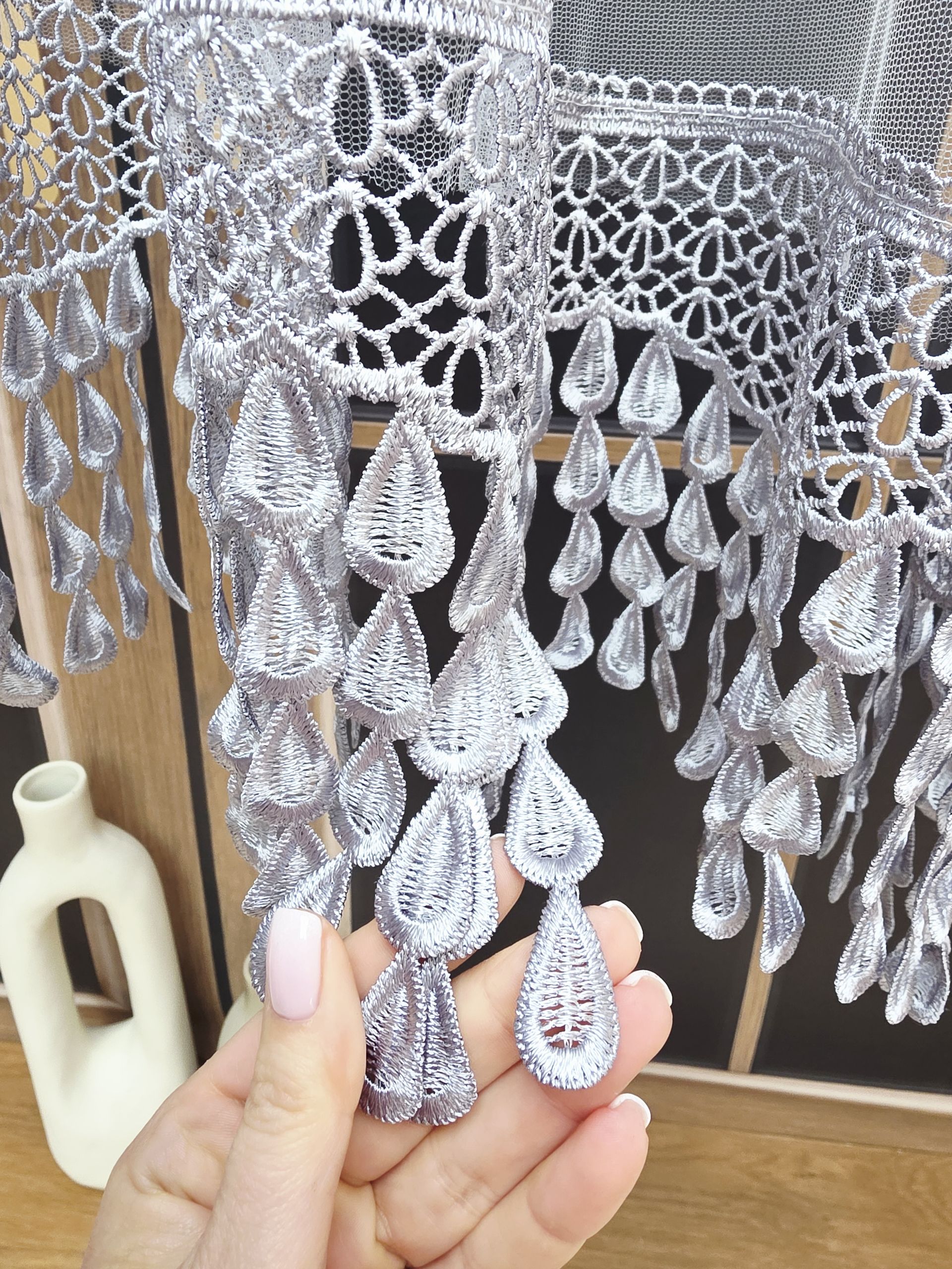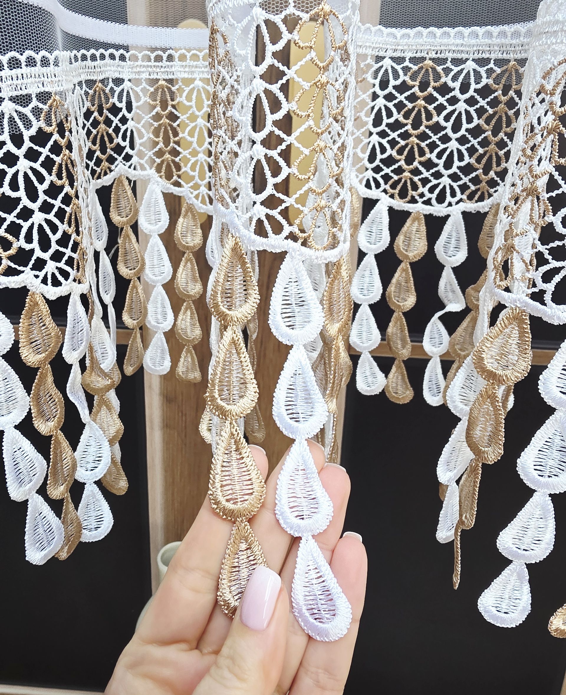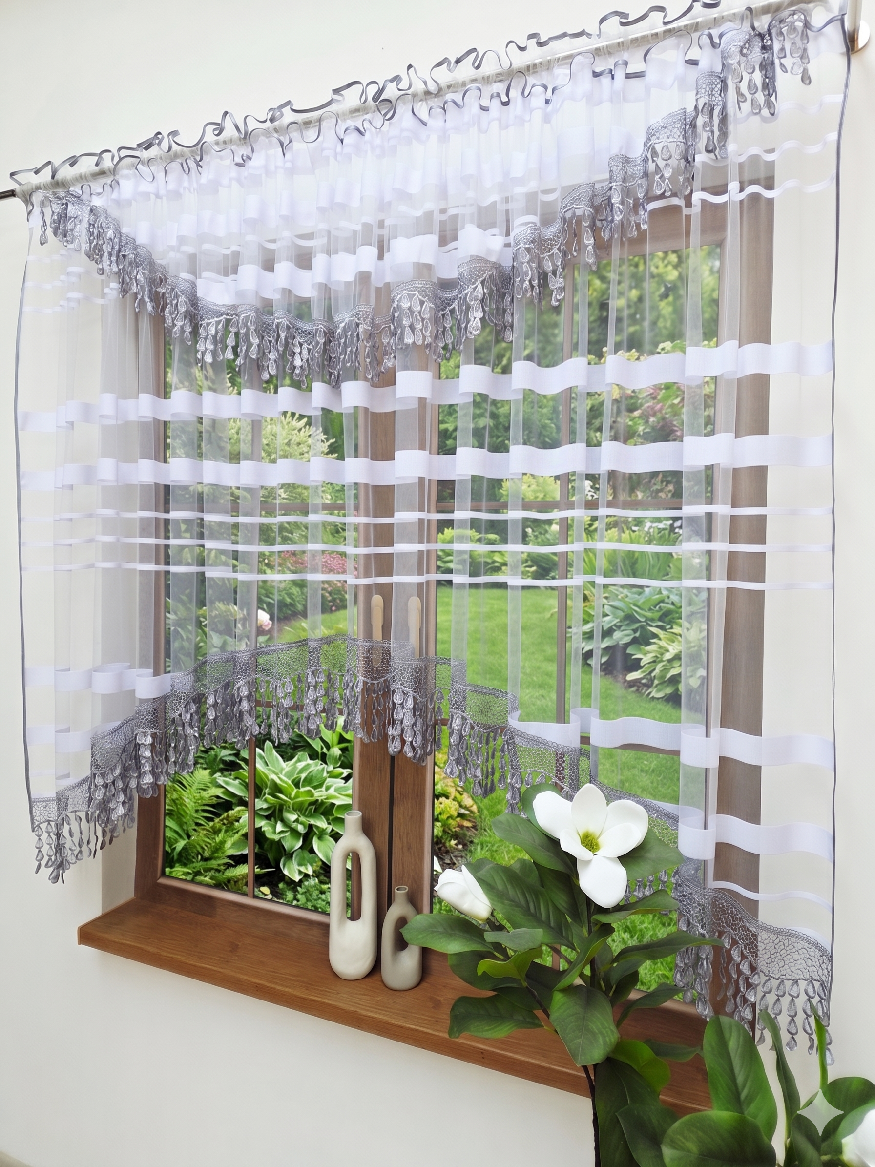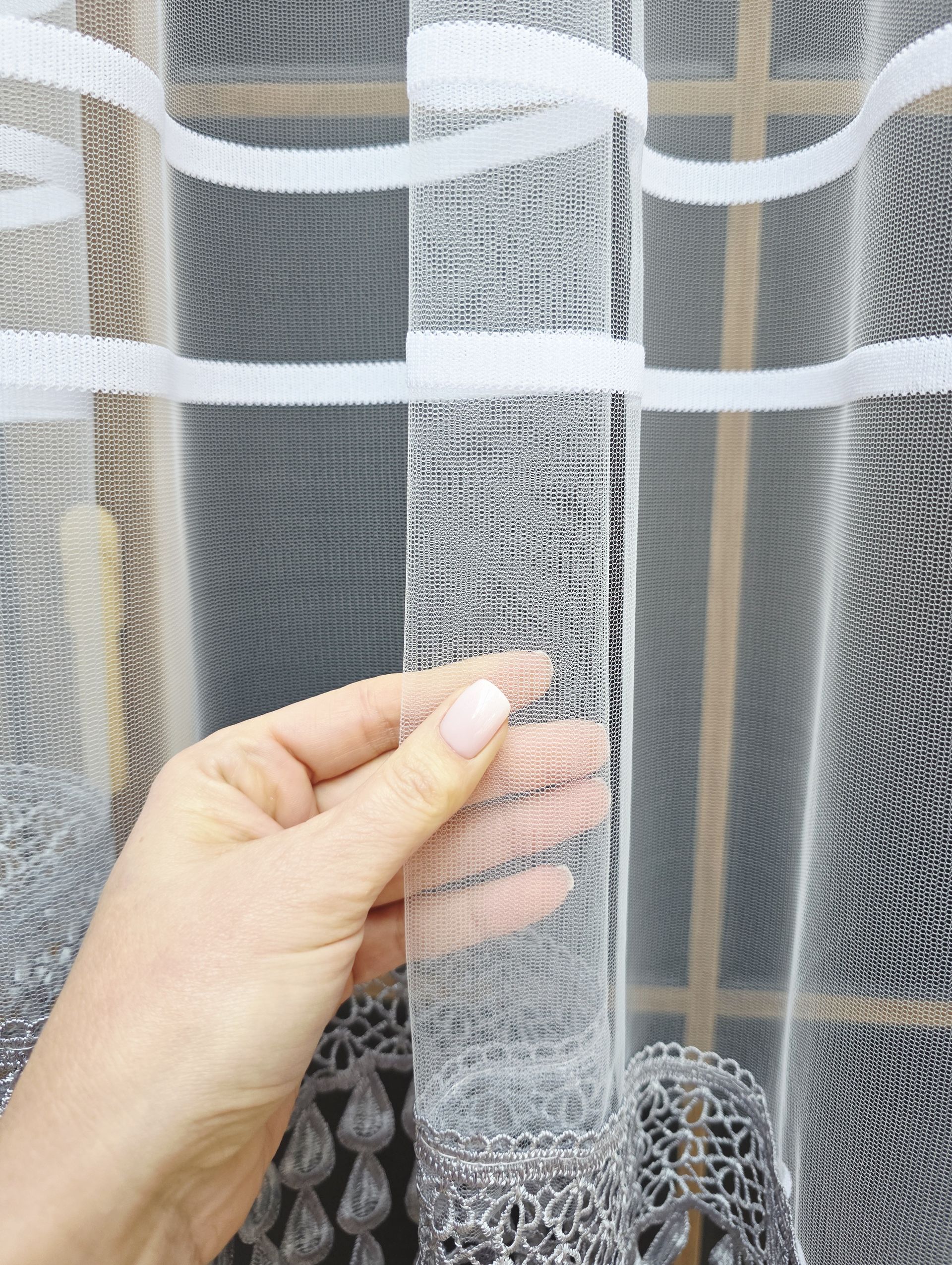 Model Orivo to propozycja dla osób, które cenią sobie wyraziste dekoracje okienne z nutą finezji. Ta wyjątkowa firana, wykonana z siatki, łączy w sobie nowoczesny minimalizm poziomych pasów z tradycyjnym urokiem bogatych zdobień gipiurowych.