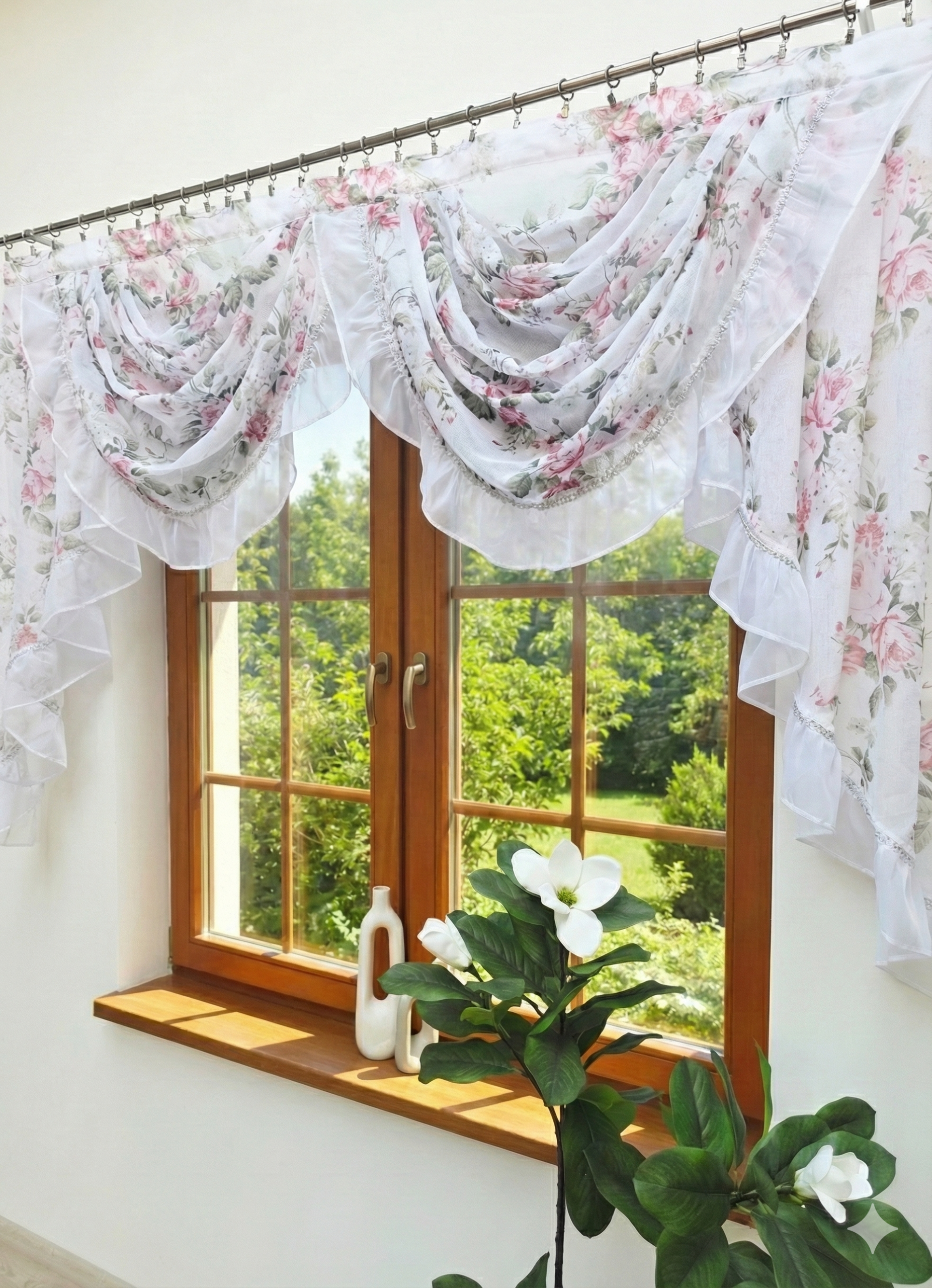 Firana została zaprojektowana w formie eleganckich, miękko układających się „wód”, które nadają oknu sielski wygląd bez ograniczania dopływu naturalnego światła.