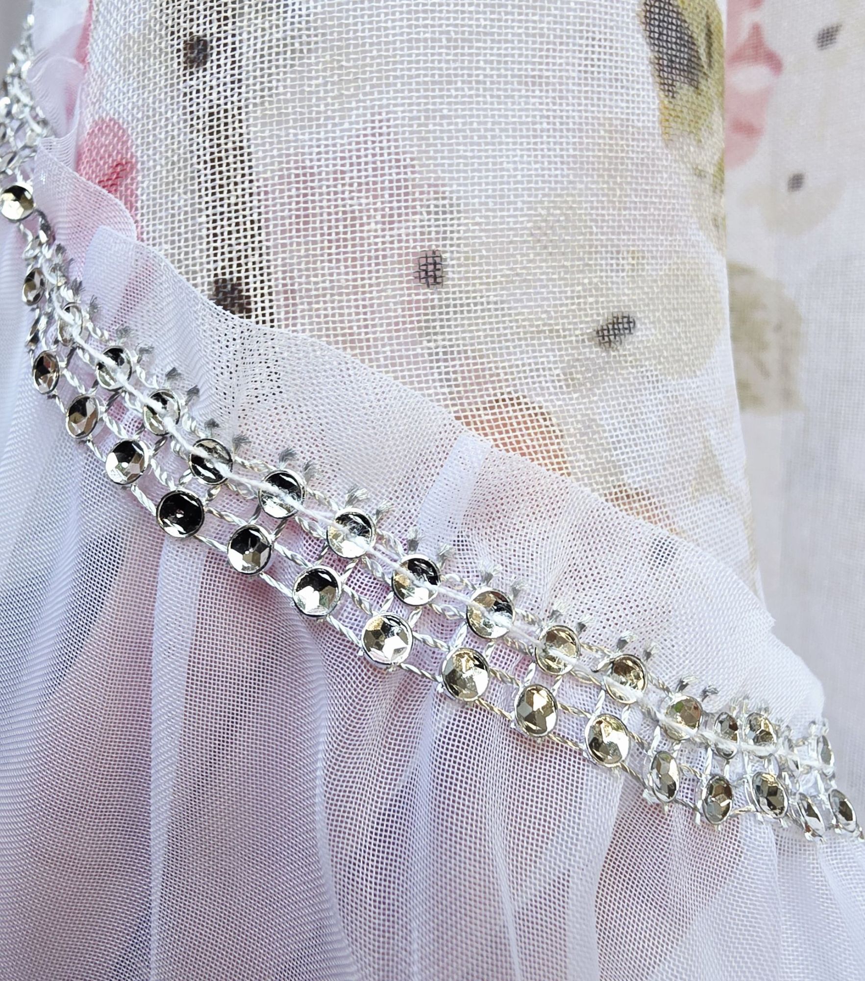 Brzegi firany zostały obszyte efektowną falbanką oraz dekoracyjną taśmą z połyskującymi cyrkoniami, która pięknie mieni się w świetle, dodając całości szyku.