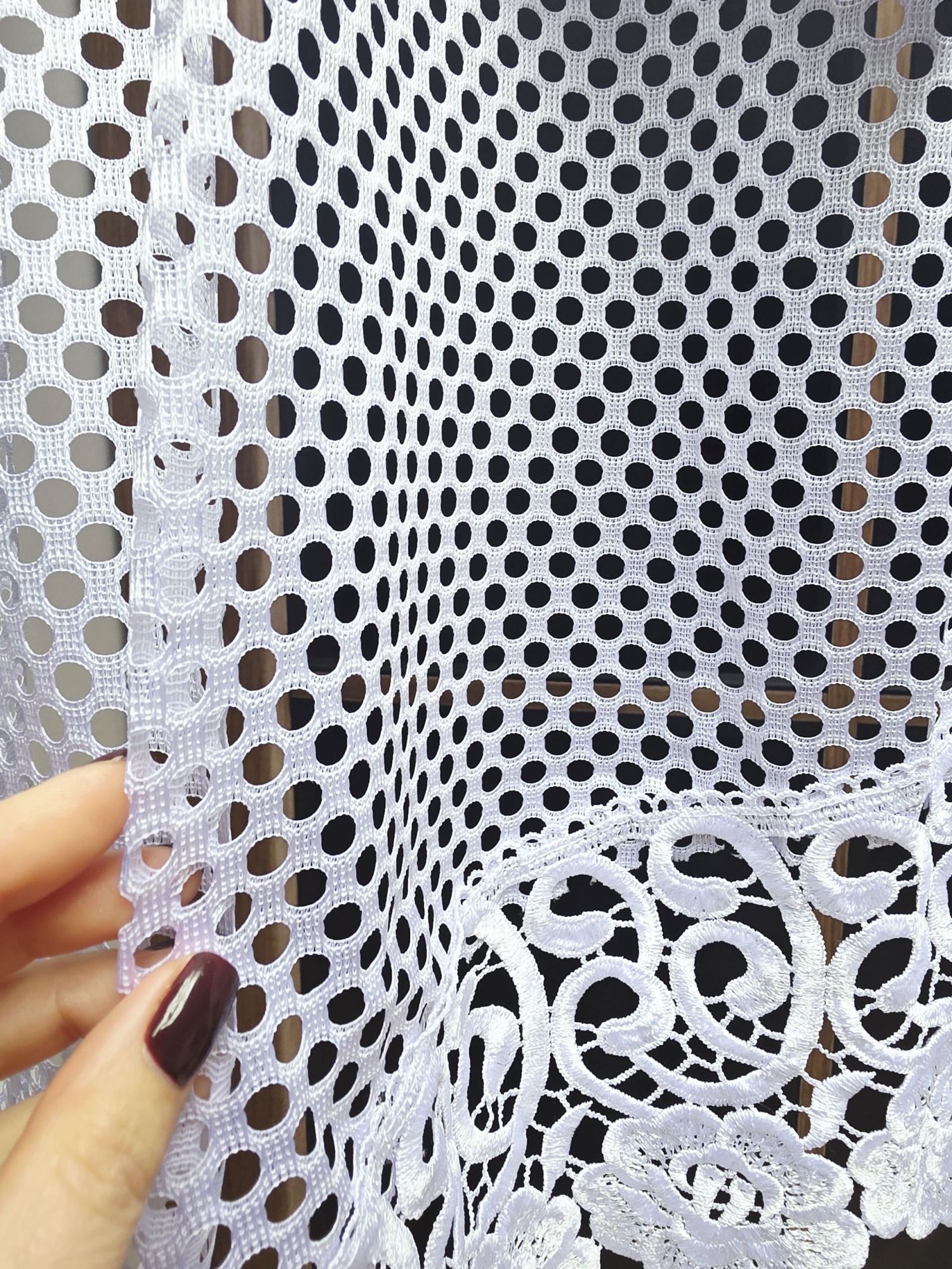 Firana została uszyta z delikatnej, białej siatki, która charakteryzuje się dużą przepuszczalnością światła i powietrza. Materiał ten jest niezwykle praktyczny – pięknie się układa i jest łatwy w pielęgnacji.