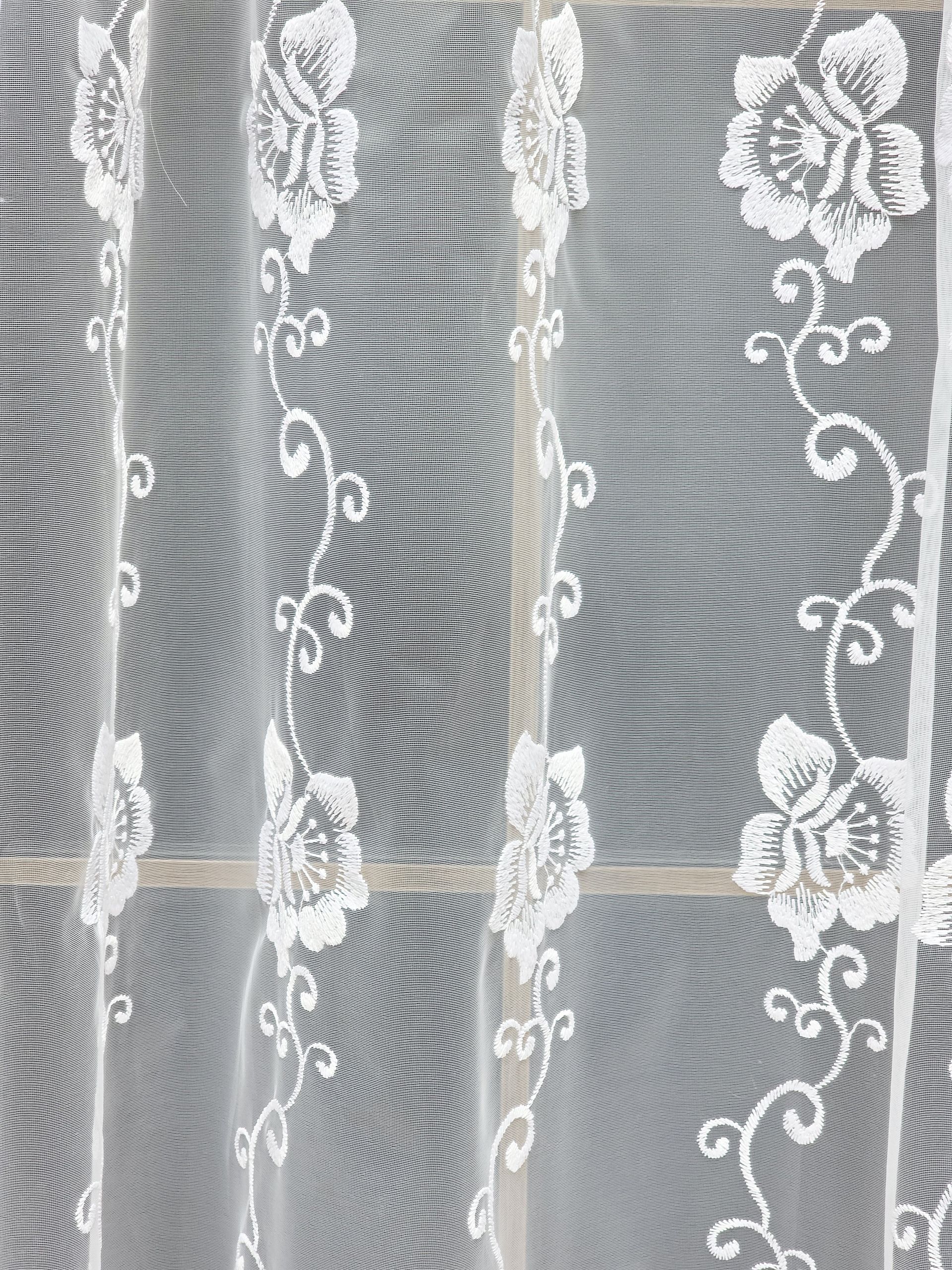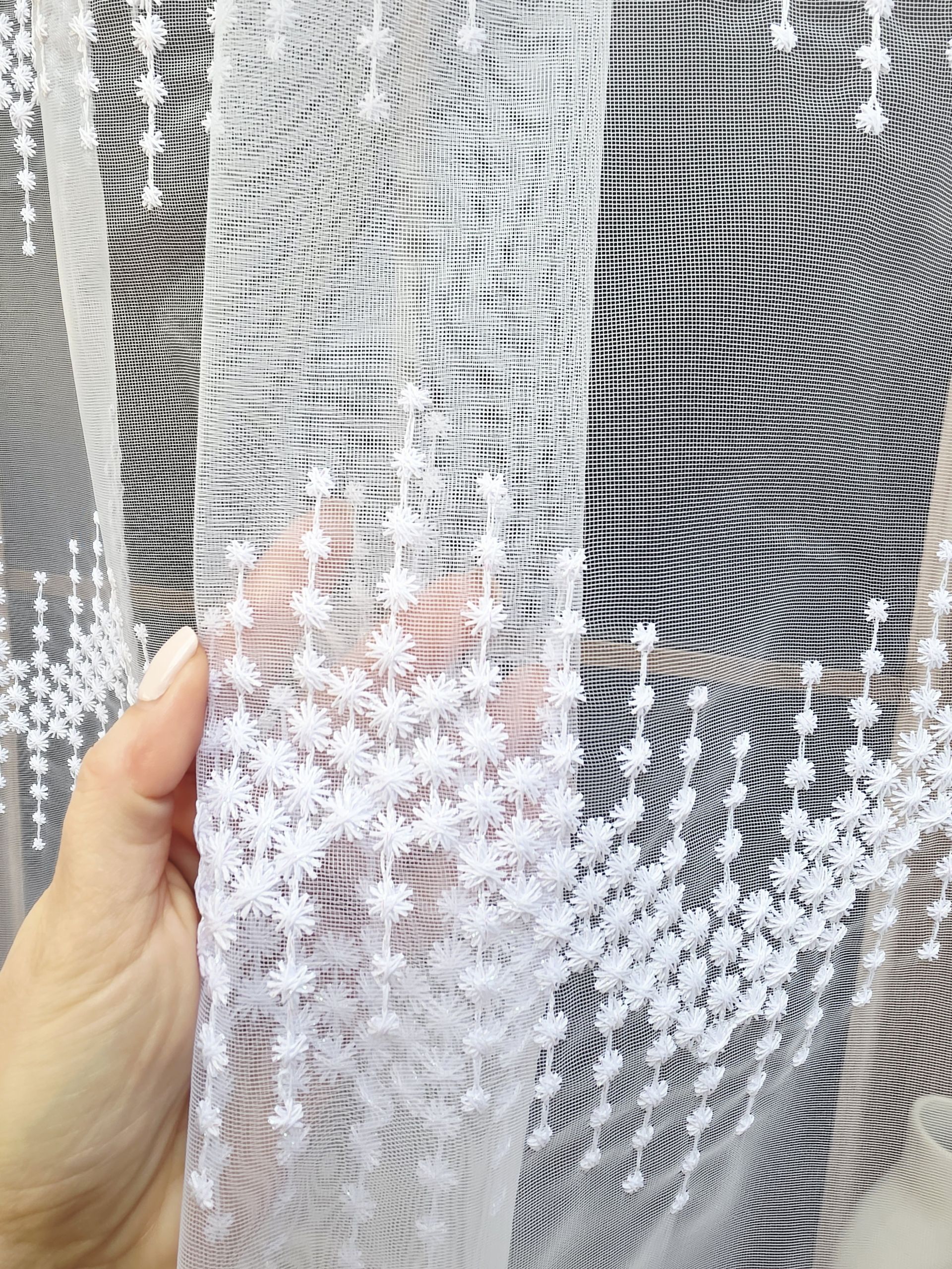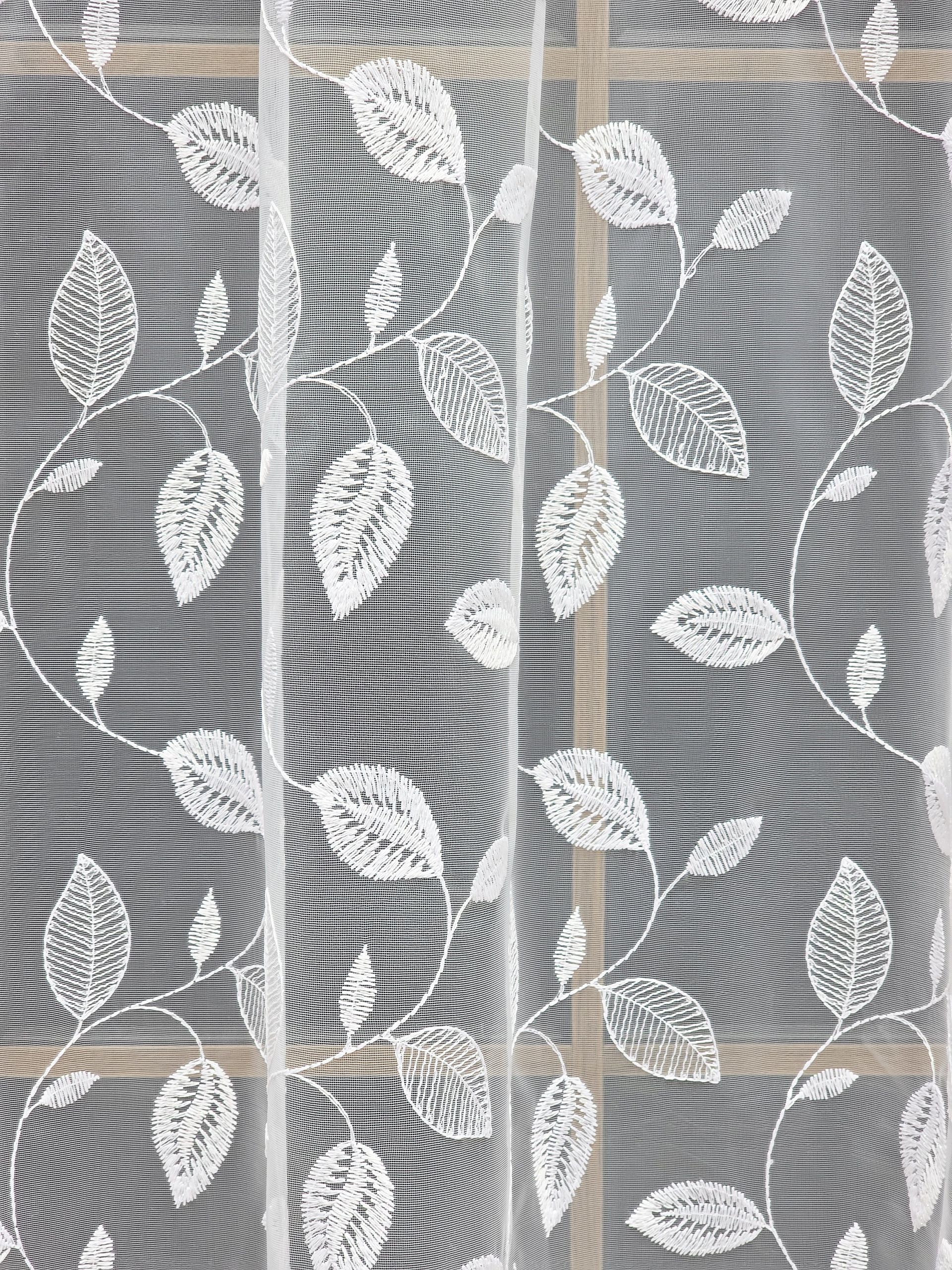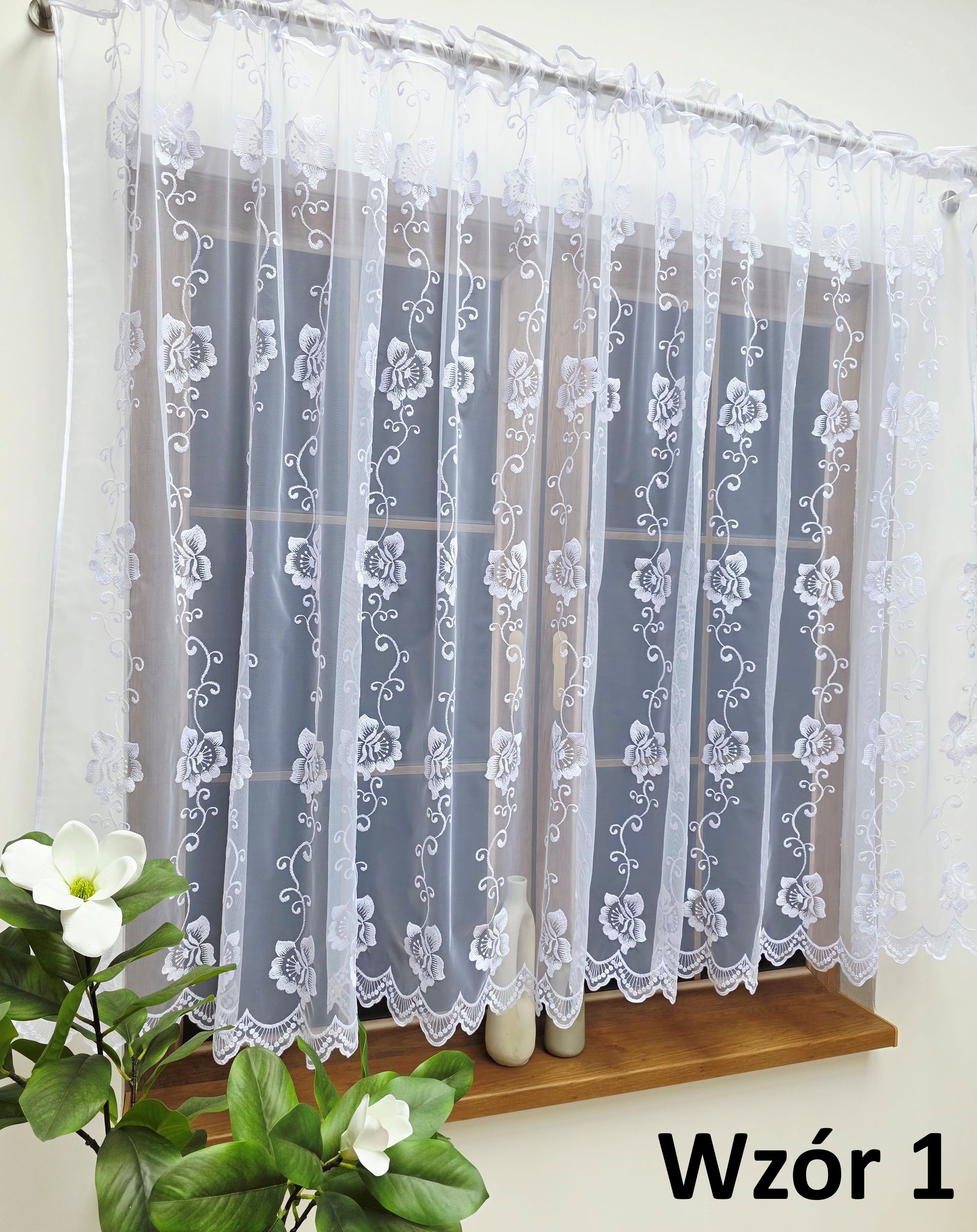 Wymiar 300×180 cm to standard dla karniszy o szerokości od 120 do 180 cm. Przy takim rozmiarze firana marszczy się w sposób naturalny, tworząc estetyczne fale, które podkreślają detale haftu.
