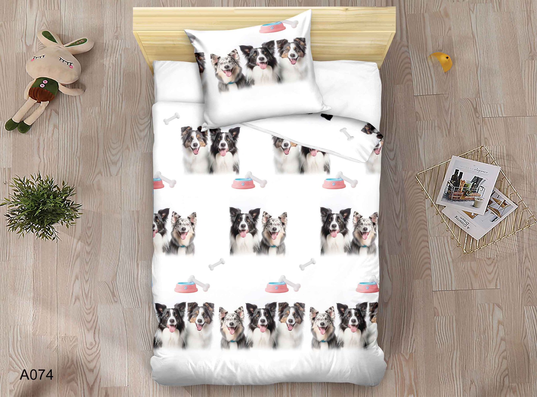 Rozjaśnij pokój swojego dziecka i zachęć do słodkich snów z naszym uroczym kompletem pościeli, który przedstawia rzędy wesołych szczeniąt rasy Border Collie! Na czystym, białym tle te inteligentne i lojalne psy, w klasycznych czarno-białych i rzadziej spotykanych merle umaszczeniach, prezentują się niezwykle uroczo. Całość wzoru uzupełniają białe kości oraz różowe miski, co tworzy spójny i dziecięcy design.