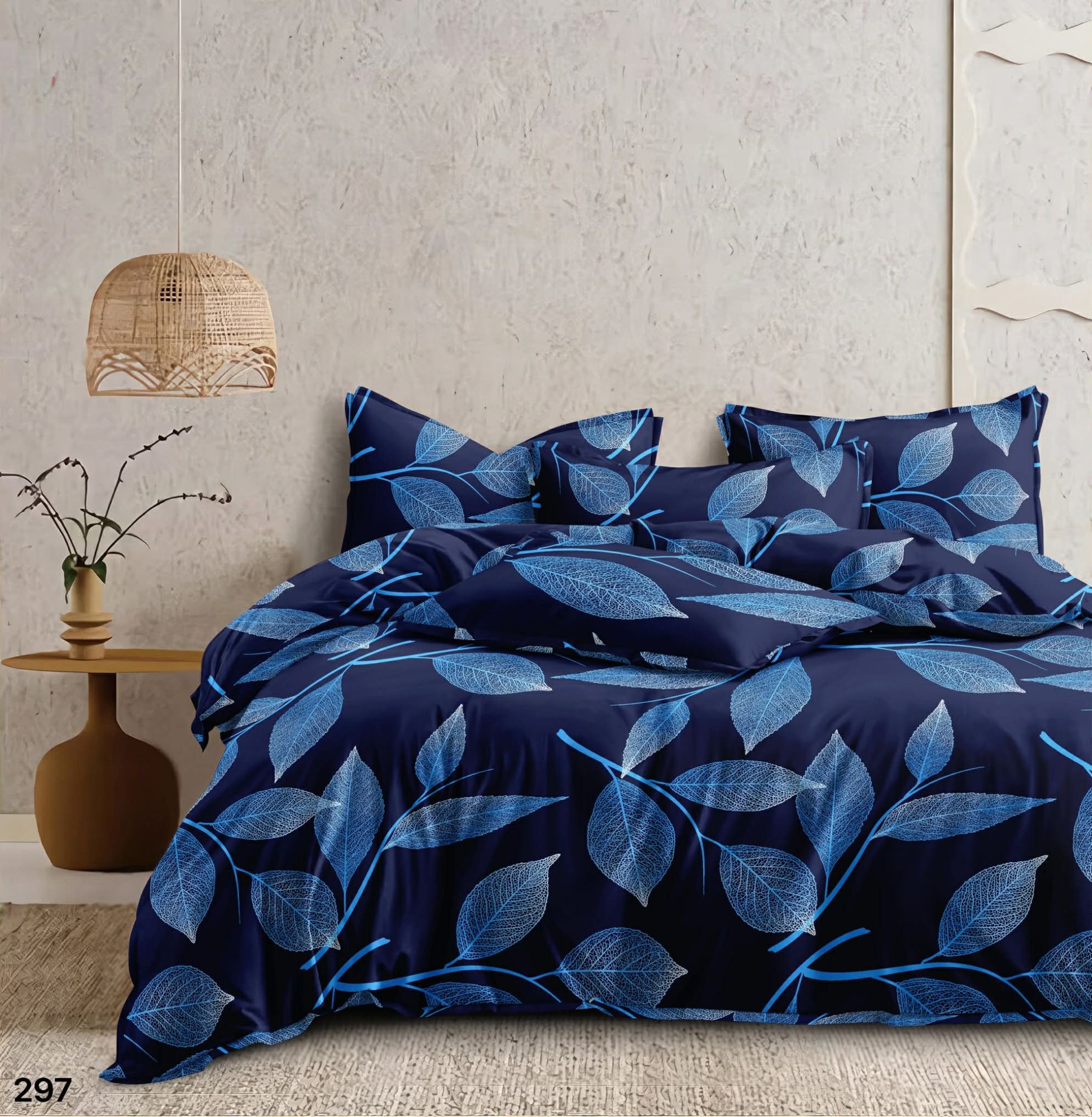 Przedstawiamy Państwu wyjątkowy komplet pościeli 297, który łączy w sobie nowoczesny design z kojącym motywem natury. Ta propozycja to idealny wybór dla osób, które pragną wprowadzić do swojej sypialni powiew świeżości, nie rezygnując przy tym z najwyższego komfortu snu. Głównym atutem prezentowanego zestawu jest jego głęboka, nasycona kolorystyka. Tło w odcieniu ciemnego granatu, przywodzącego na myśl nocne niebo, stanowi doskonały fundament dla misternie zaprojektowanego wzoru. Na powierzchni tkaniny rozpościerają się delikatne, błękitne liście.