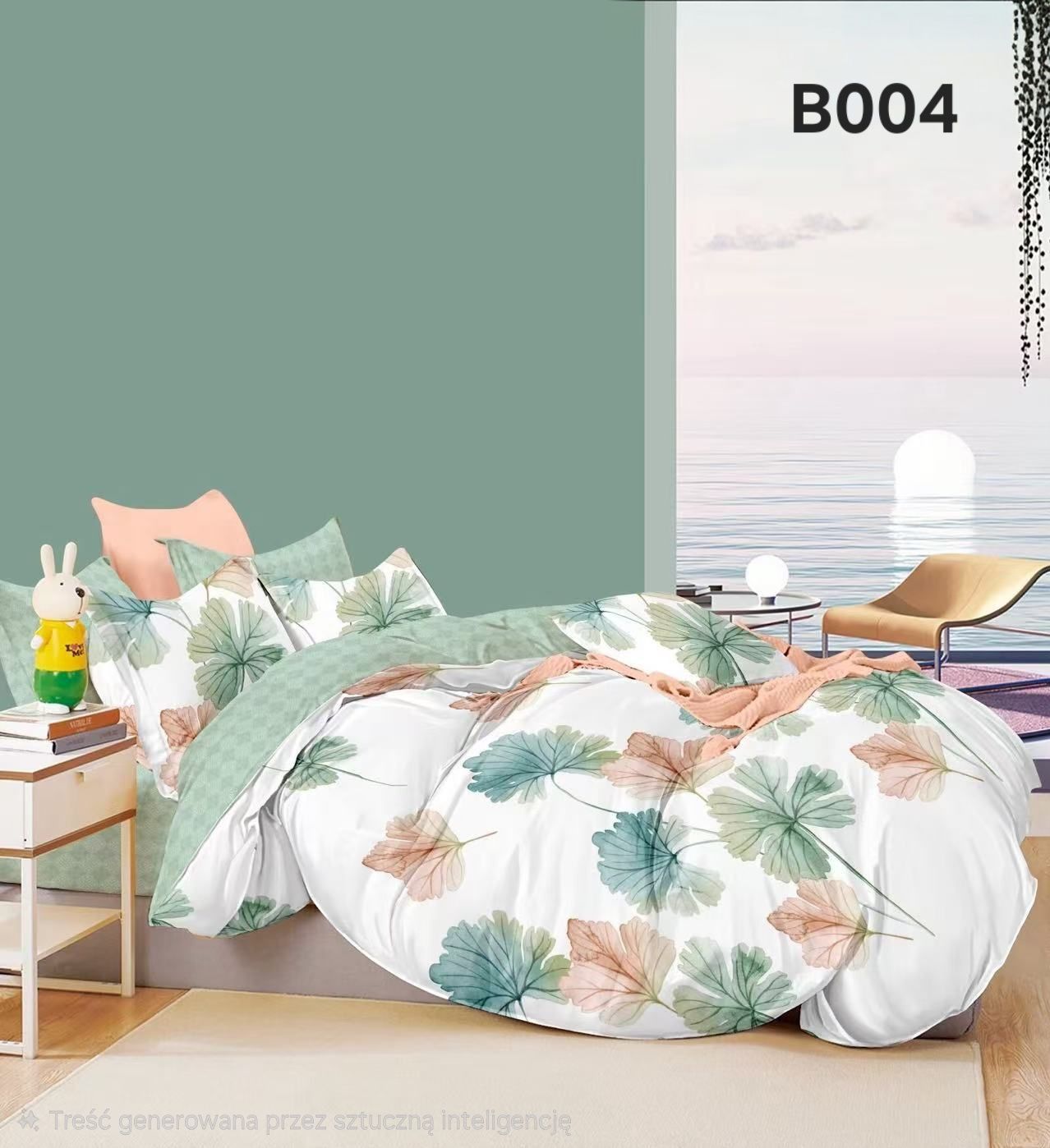 Poszukujesz sposobu na wprowadzenie do sypialni harmonii i świeżości? Model B004 to propozycja, która łączy w sobie subtelność natury z nowoczesnym designem. Głównym motywem dekoracyjnym są delikatne, rozłożyste liście, które przypominają akwarelowe malunki. Kompozycja opiera się na zestawieniu stonowanej, szałwiowej zieleni z subtelnymi akcentami pudrowego różu i łososia. Całość naniesiona jest na czyste, białe tło, co sprawia, że pościel wygląda niezwykle lekko i nie przytłacza wnętrza.