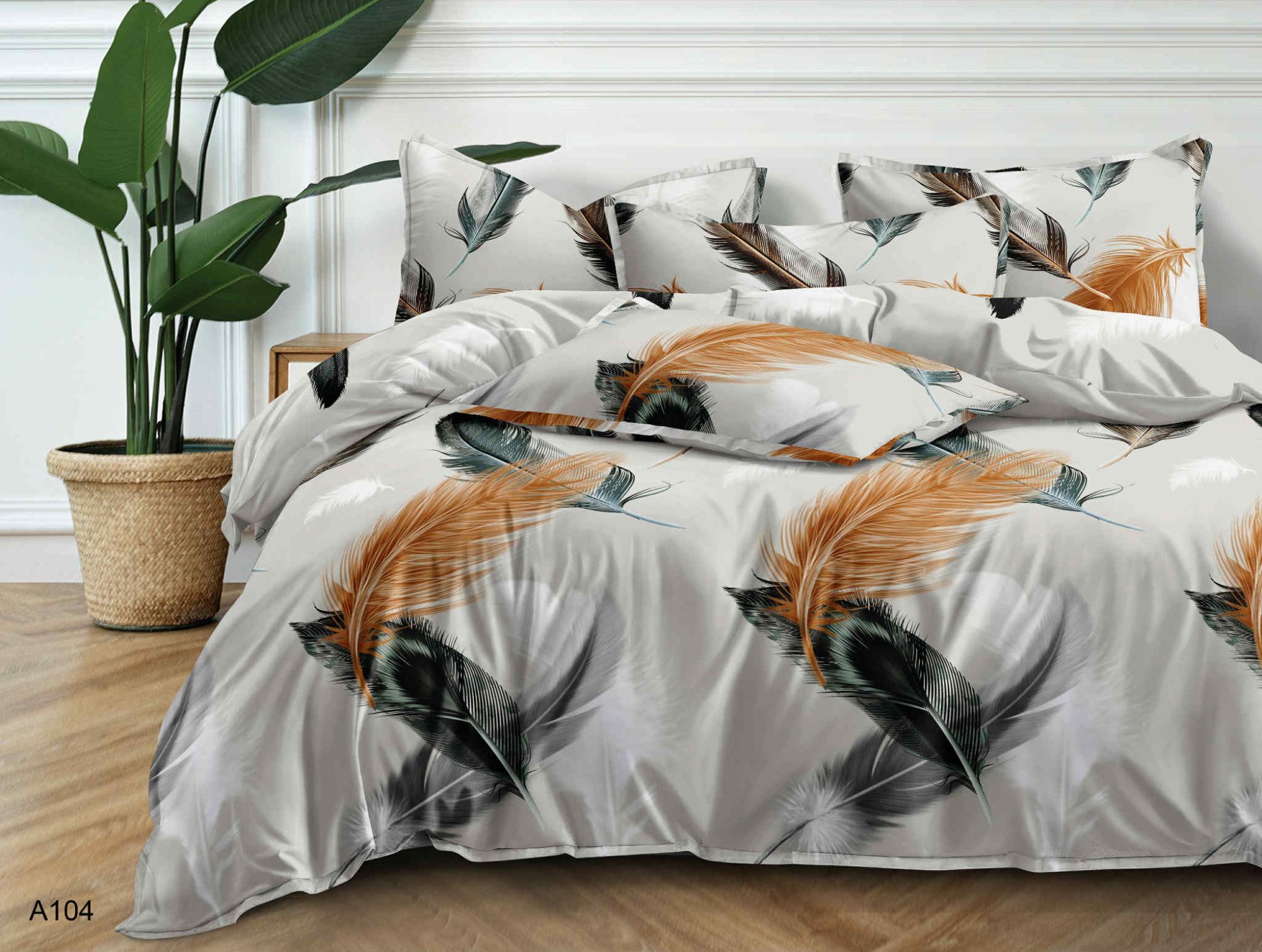 Głównym atutem tej pościeli jest jej kolorystyka oraz precyzja wykonania wzoru. Na stonowanym, jasnym tle (delikatna szarość lub złamana biel) rozmieszczono duże, dynamiczne motywy piór. Kontrastowe zestawienie głębokiej czerni z ciepłymi, miodowymi akcentami nadaje całości głębi i sprawia, że pościel prezentuje się niezwykle luksusowo. Dzięki zastosowaniu nowoczesnych technik nadruku, detale są ostre, a kolory zachowują swoją intensywność nawet po wielu praniach.