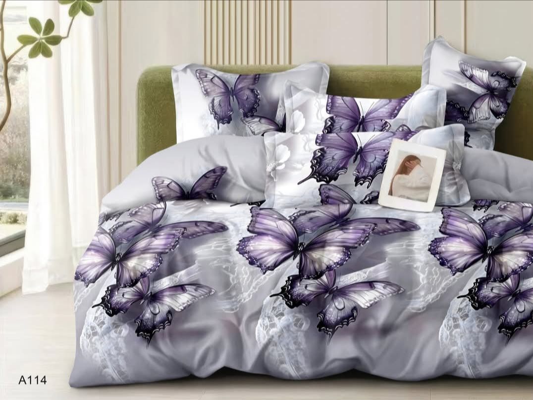 Przemień swoją sypialnię w krainę spokoju i subtelnej elegancji dzięki wyjątkowemu kompletowi pościeli A114, który łączy w sobie nowoczesny design z klasycznym urokiem natury. Model prezentowany na zdjęciu to propozycja dla osób, które cenią sobie niebanalne wzornictwo oraz kolorystykę wprowadzającą do wnętrza harmonię. Głównym motywem dekoracyjnym są przepiękne, duże motyle w odcieniach głębokiego fioletu i ametystu. Ich skrzydła, oddane z niezwykłą dbałością o detale, zdają się niemal ożywać na tle delikatnego, perłowo-szarego materiału.